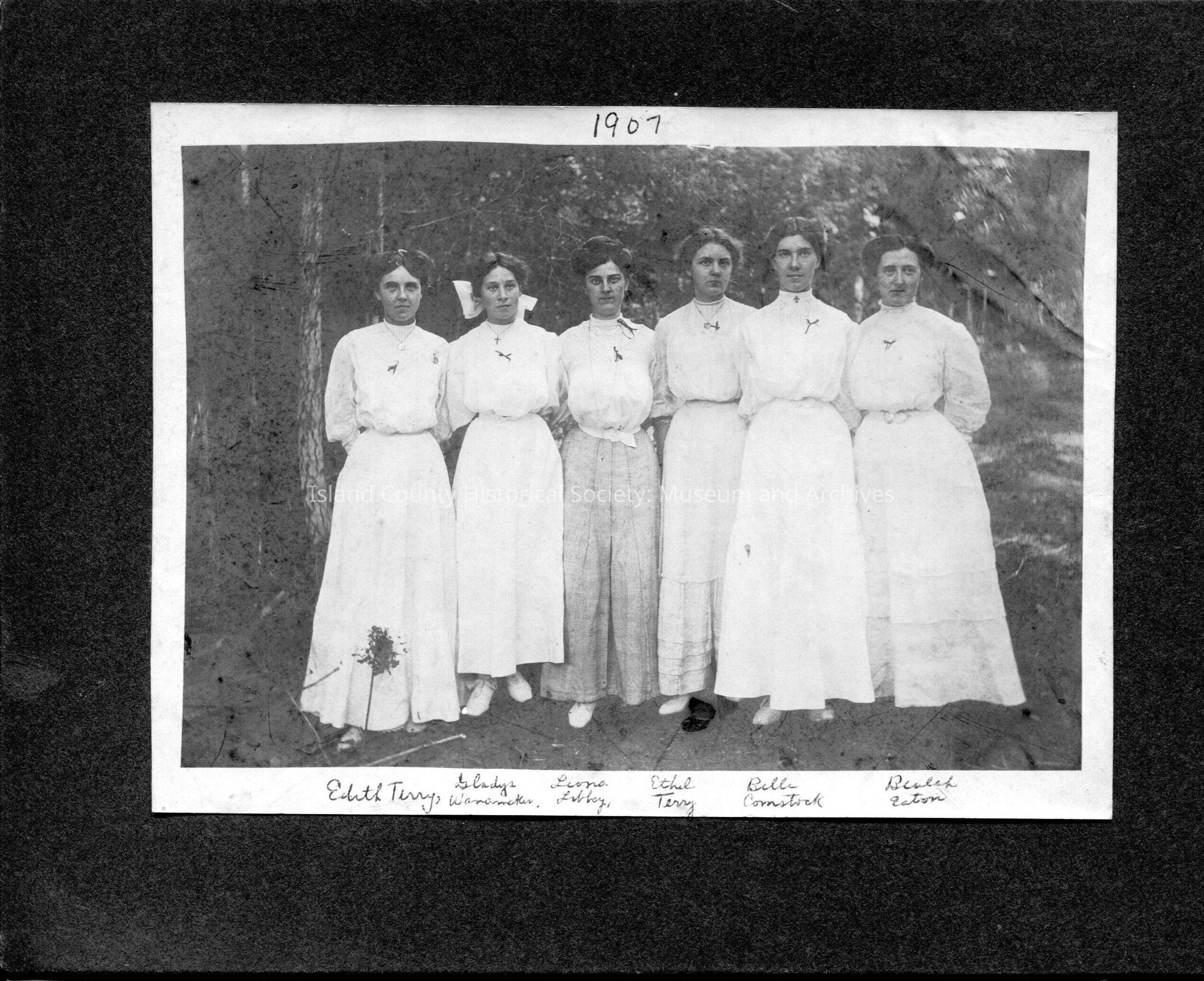 Black and white photo of Edith Terry, Gladys Wanamaker, Leona Libbey, Ethel Terry, Belle Comstock, and Beulah Easton. The ladies are all wearing white shirts and skirts in the photo and the backdrop is of a forested area. On the back of the photo is written "The Change Brigade" August 8, 1907.