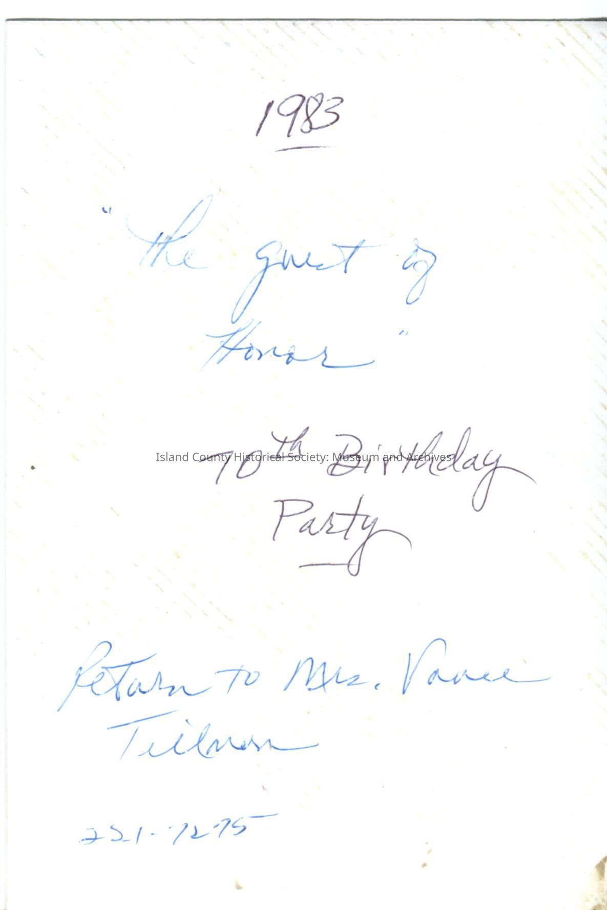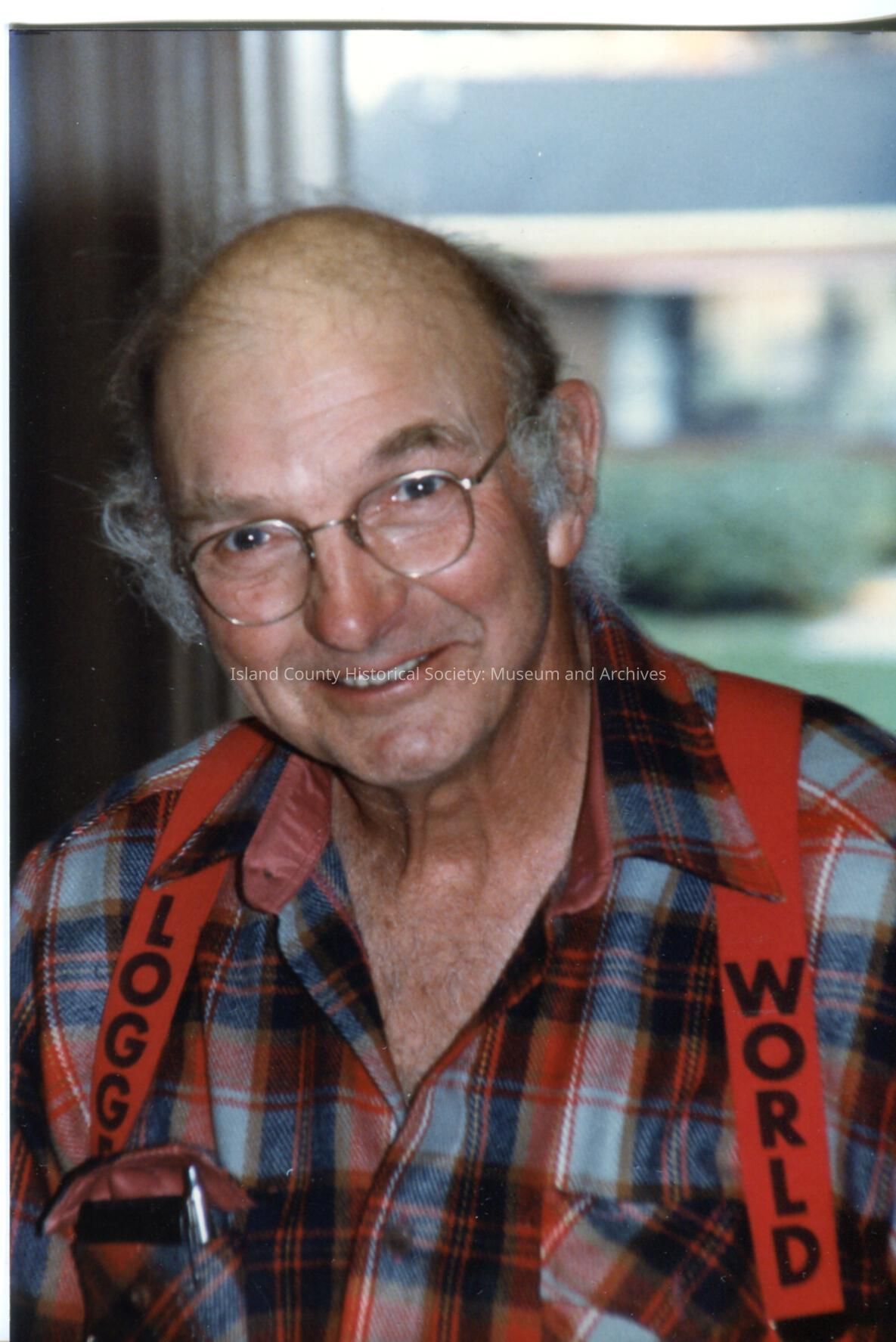 Color photograph of Ray Edward Fossek, wearing a plaid shirt, suspenders with Logg and World on them. He is wearing glasses and has a pen and another item in his front right pocket. He is in front of a window - can see another house through the window. Photo was taken by Louie Schiermeyer. This was his surprise birthday for him a brookhaven. He thought he was going to do an interview with Lorna Cherry. The family took his memorabilia and decorated Brookhaven with it. He walked in and started stating "I have a fishing rod just like that! I have a toy tractor just like that!" Then everyone yelled Happy birthday. The famiy got away with hosting a surprise birthday for him on his 70th, 80th, and 90th. He passed away January 30, 2007 at his home in Langley.