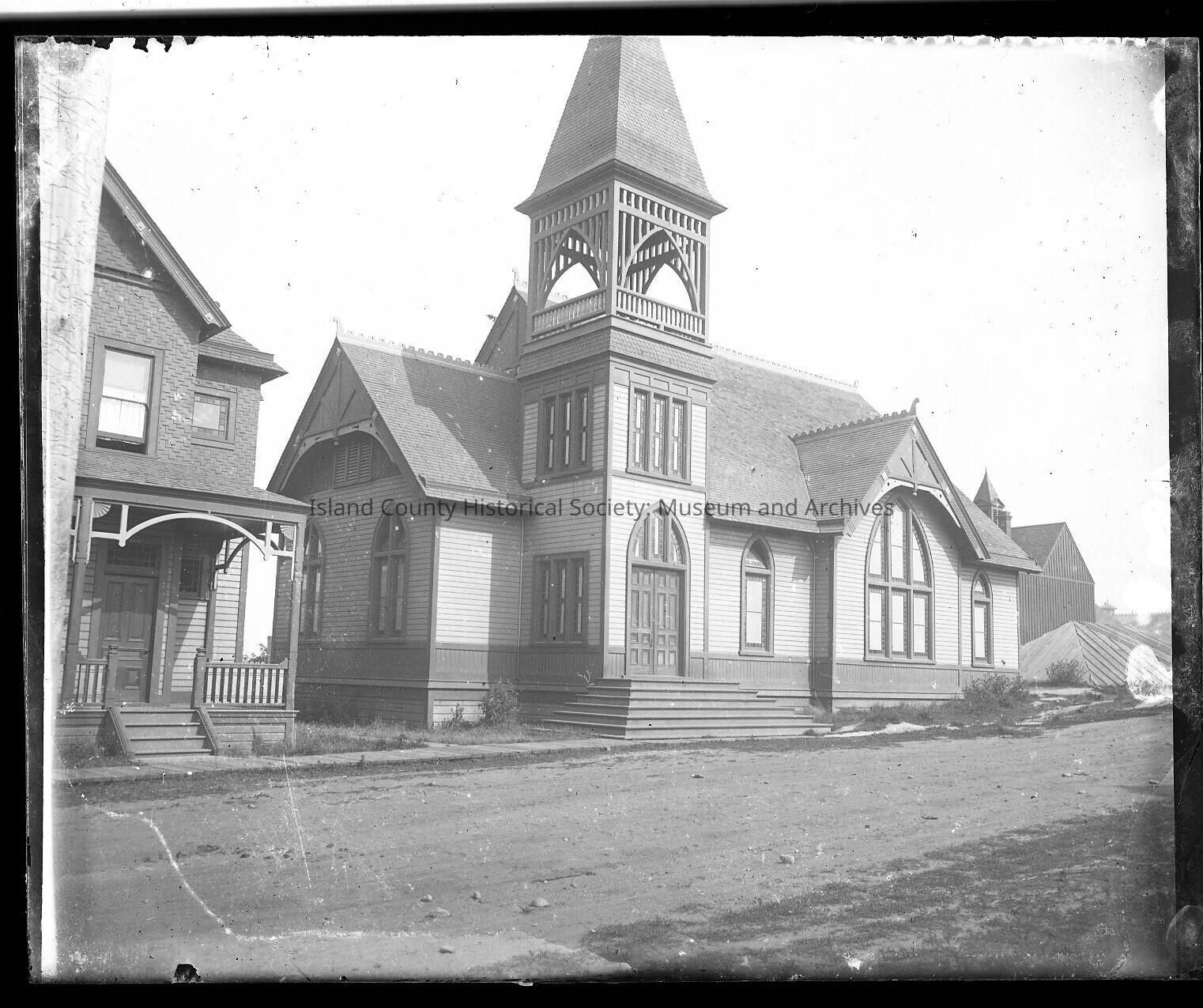 Photo of a Coupeville wooden church and a two-story wood house and a barn beyond the church. Dirt road in front with a wood sidewalk. Steeple.Made/Created