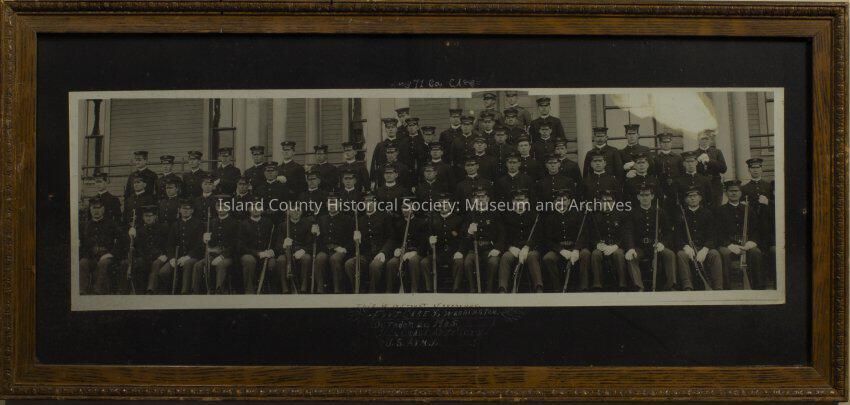 71st Co. Coast Artillery at Fort Casey, WA. In this black and white photo the men of the 71st company are seated for a photo in uniform. On the picture the location is written as the front of our house. The picture was taken October 20, 1905. Faintly written in green is Ross B. Pool with a line leading down to a man whose face is circled third row up and 10th person in from the left.