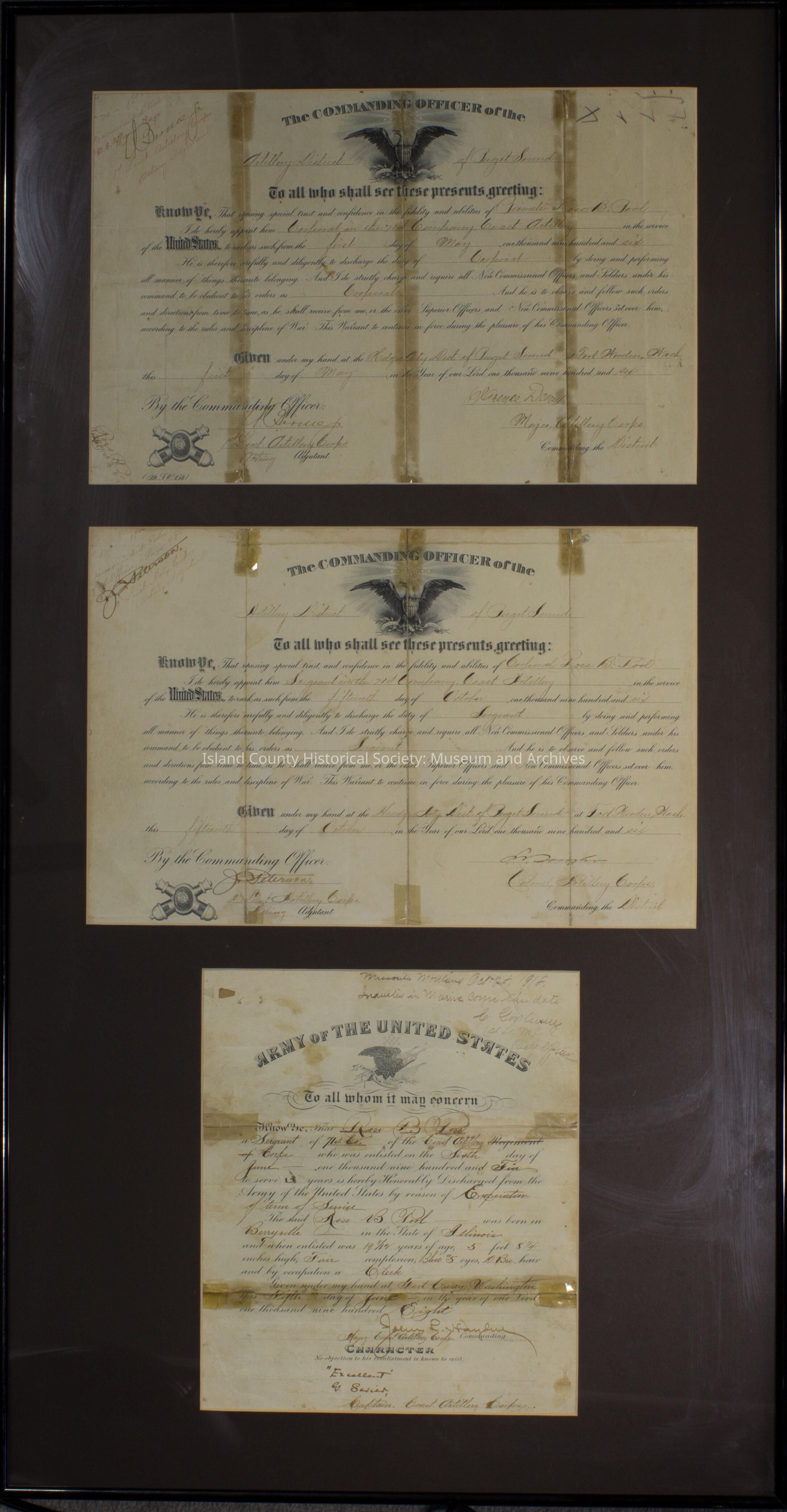 This item contains 3 framed certificates of achievement for Ross Pool during his time in the U.S. Army. The first certificate is for his promotion to Corporal and the second is when Pool was promoted to Sergeant in 71st company. The last certificate in the frame is a certificate showing his honorable discharge from the U.S. Army. Each certificate is date: May 1906, October 1906, and June 1908.