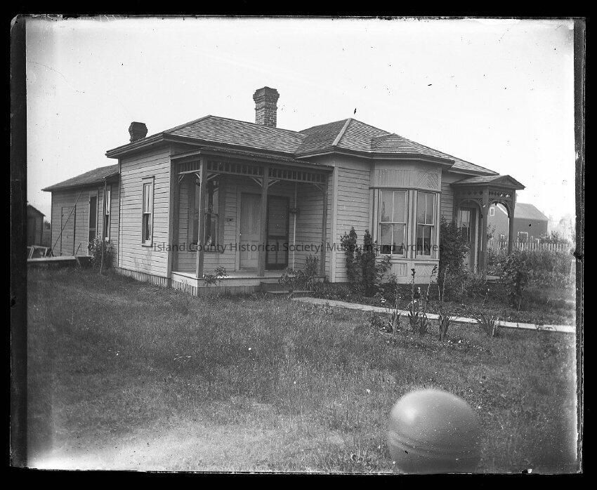 Photo of Coupeville one-story wooden house. Sidewalk, bay window, two chimneys, two porches.Made/Created