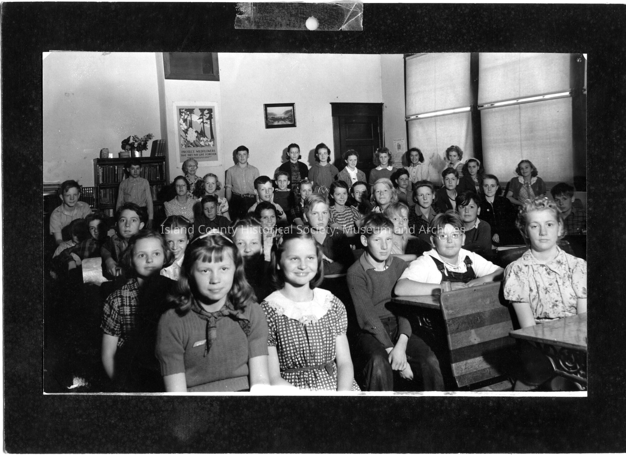 Black and white photo of a group of 40 students and 1 teacher in a classroom. The tall windows have shades over all of them. The children are seated at desks and some doubled up on the seats to get in the picture. The photo is mounted on black cardboard.