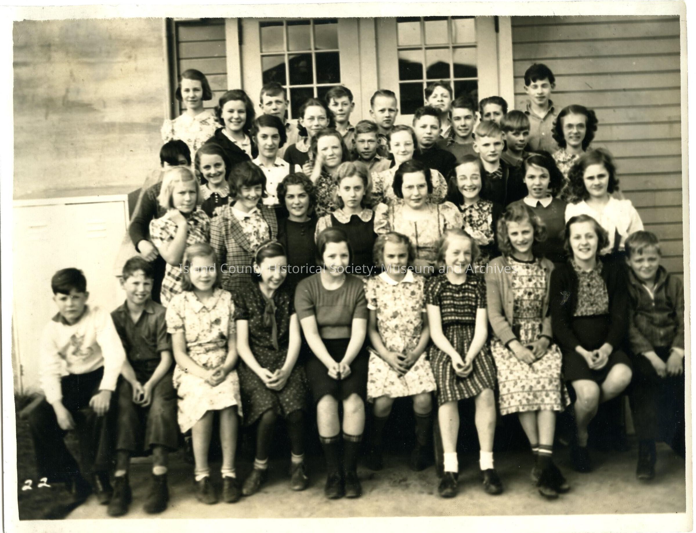 Black and white photo of a group of 37 students and 1 teacher (center of second row) sitting or standing on a porch outside a wood-sided building. They are in front of French doors. The girls are wearing dresses or skirts (knee-length), bobby socks or knee socks and shoes. The boys are wearing shirts and trousers.