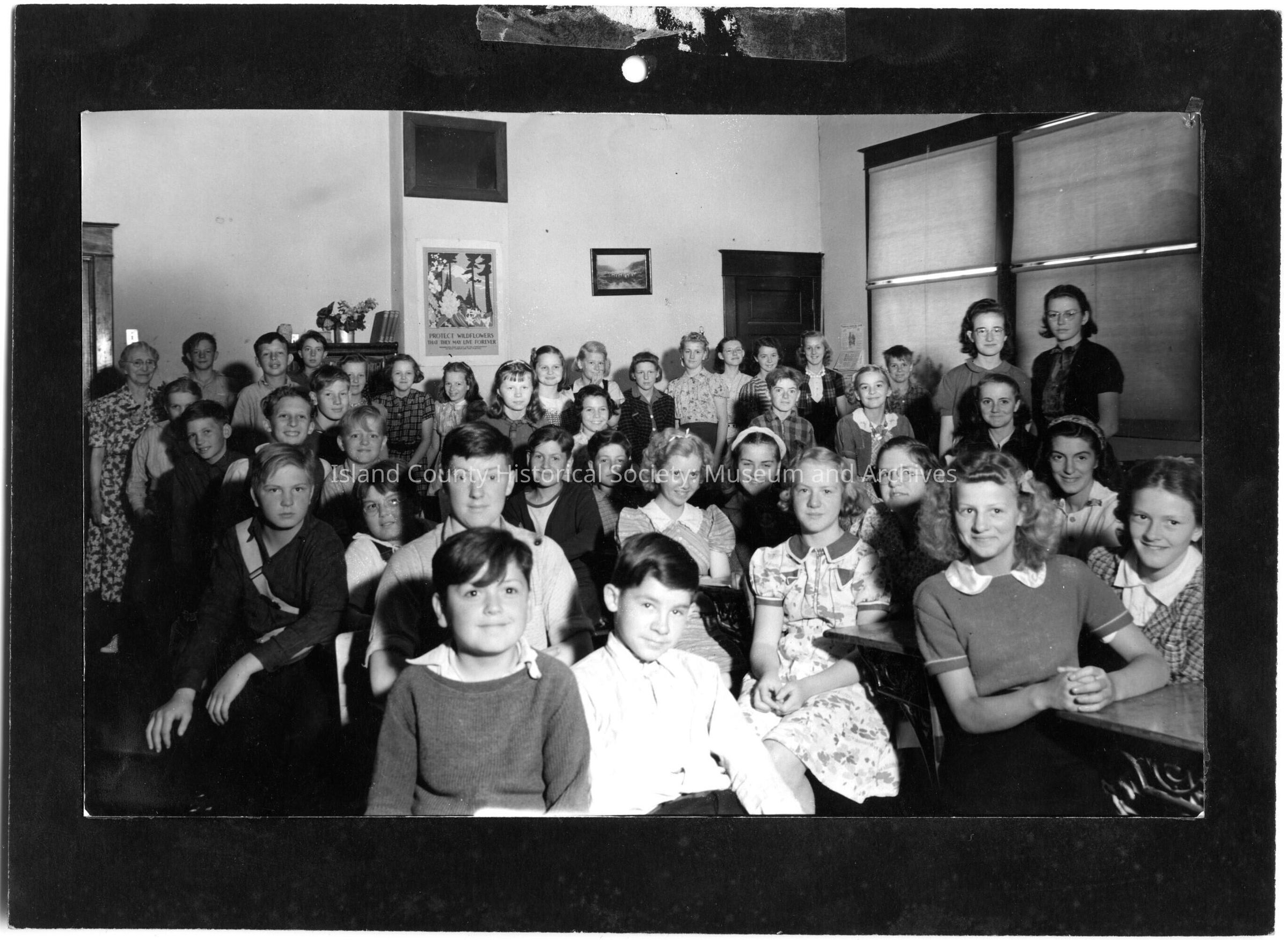 Black and white photo of a group of about 48 students and 1 teacher (standing in the back in the left corner). The girls are wearing dresses or skirts (knee-length). The boys are wearing shirts, sweaters and trousers or overalls. The children are seated at desks and some doubled up on the seats to get in the picture. The photo is mounted on black cardboard.