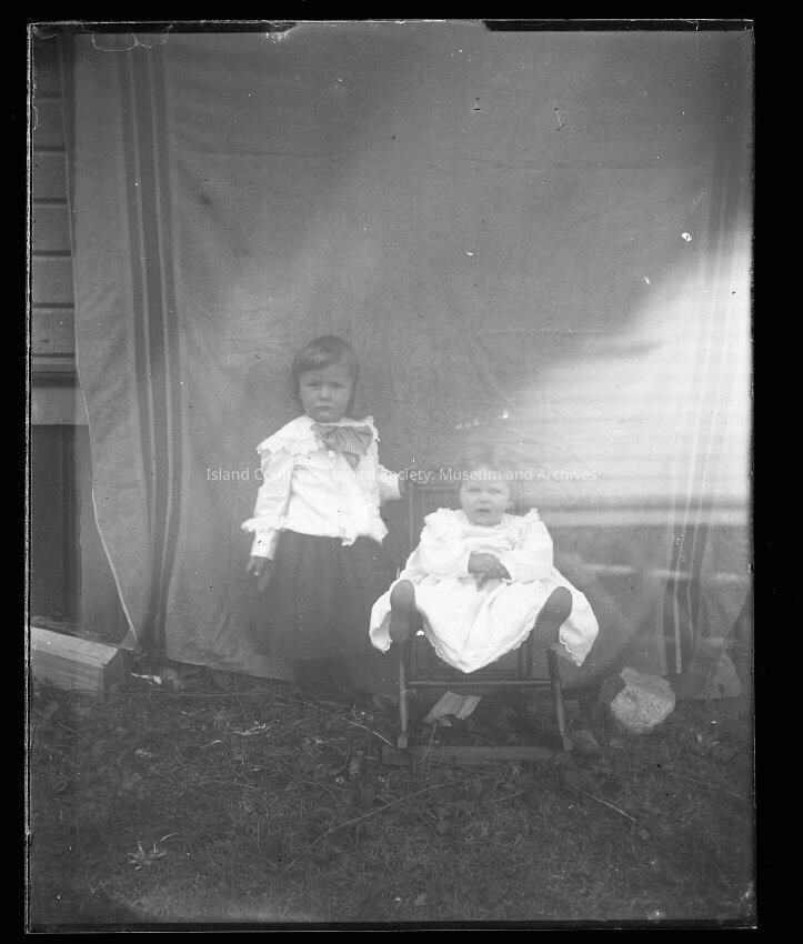 Photo of two young girls in front of a blanket backdrop in front of a wooden sided building. The standing girl is wearing a blouse with a big bow and skirt, while the younger girl seated in a chair is wearing a dress, shoes.Made/Created