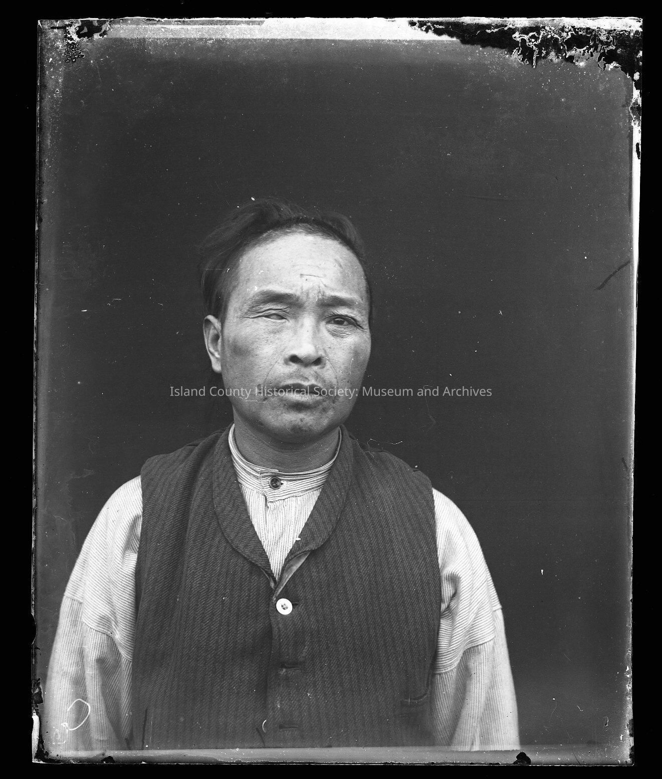 Photo of probably an Asian man, wearing a short collared shirt and vest. He has a cataract or is blind in his right eye.Made/Created