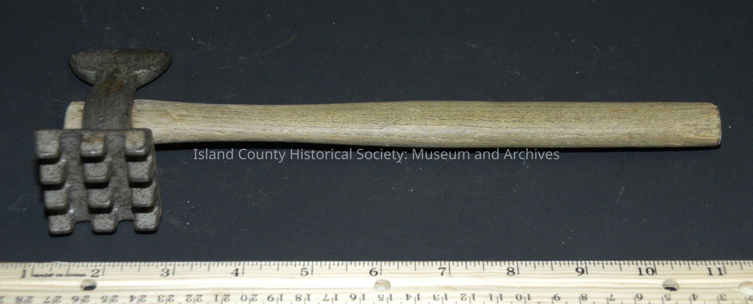 Meat tenderizer, wood handle and metal top.