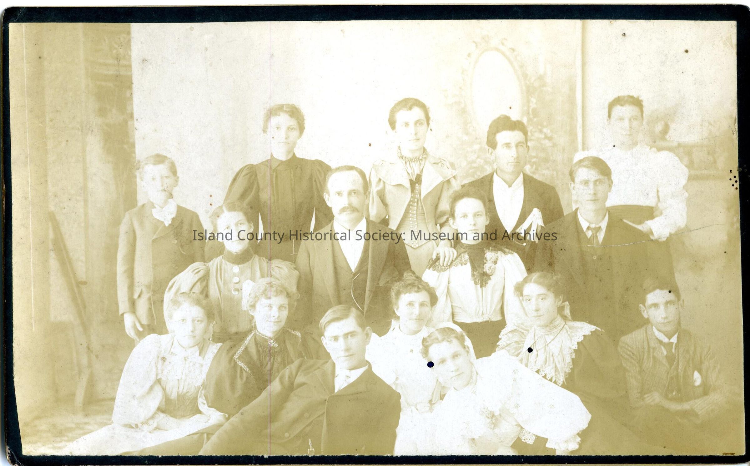 Black and white photo of a group in a large room - probably a family group - sitting on the floor or chairs, standing or posed lying on the floor. A man is in the center - mustached and wearing a suit. He is surrounded by women, young women, young men and a boy standing on the far left. The women are wearing tops and skirts or dresses - large mutton sleeves on some, lace collars, neckalaces. The men and boy are wearing suits, all but one have ties. THe man in back has some sort of lacy object in his pocket.