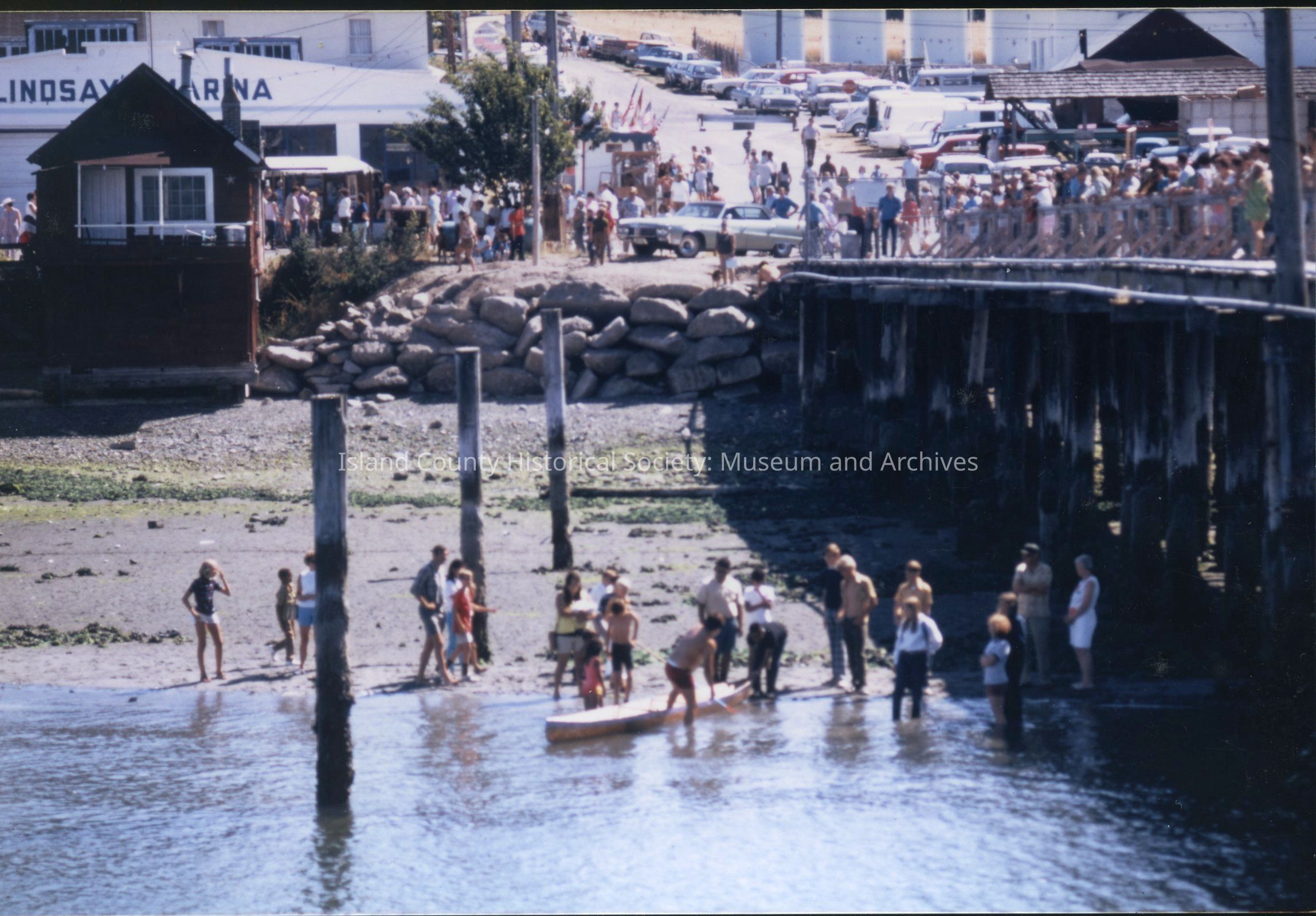 Canoe in the shallows off the Coupeville Wharf, likely during a Penn Cove Water Festival or an Arts & Crafts Festival. Onlookers stand along the wharf's walkway and in the water. C. 1960s-1970s.