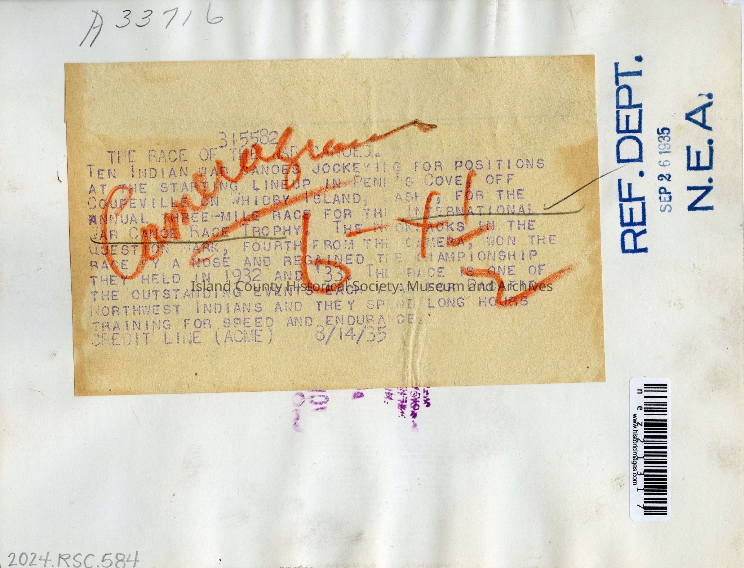 Typewritten blurb pasted on the reverse of the photo states, "Ten Indian war canoes jockeying for positions at the starting lineup in Penn's Cove, off Coupeville on Whidbey Island, Wash, for the annual three-mile race for the International War Canoe Race Trophy. The Nooksacks in the Question Mark, fourth from the camera, won the race by a nose and regained the championship they held in 1932 and '33. This race is one of the outstanding events each year for Pacific Northwest Indians and they spend long hours training for speed and endurance. Credit Line (ACME). 8/14/35."Photograph Details
