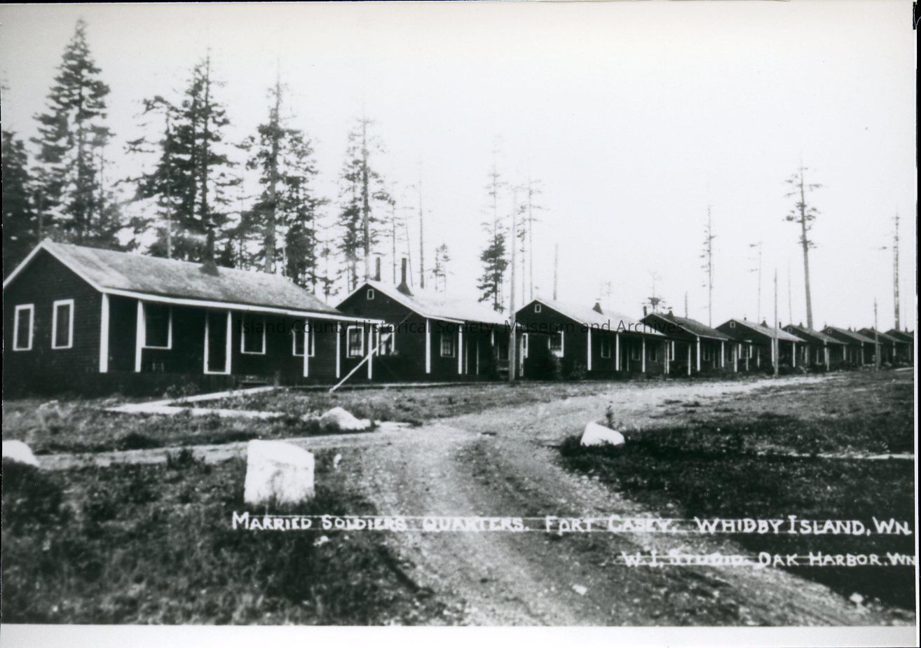 Photograph of cantonment barracks for married soldiers at Fort Casey. These buildings were built during World War I (c. 1914-1918) and were located behind the lighthouse. Photo c. 1914-1920.Photograph Details