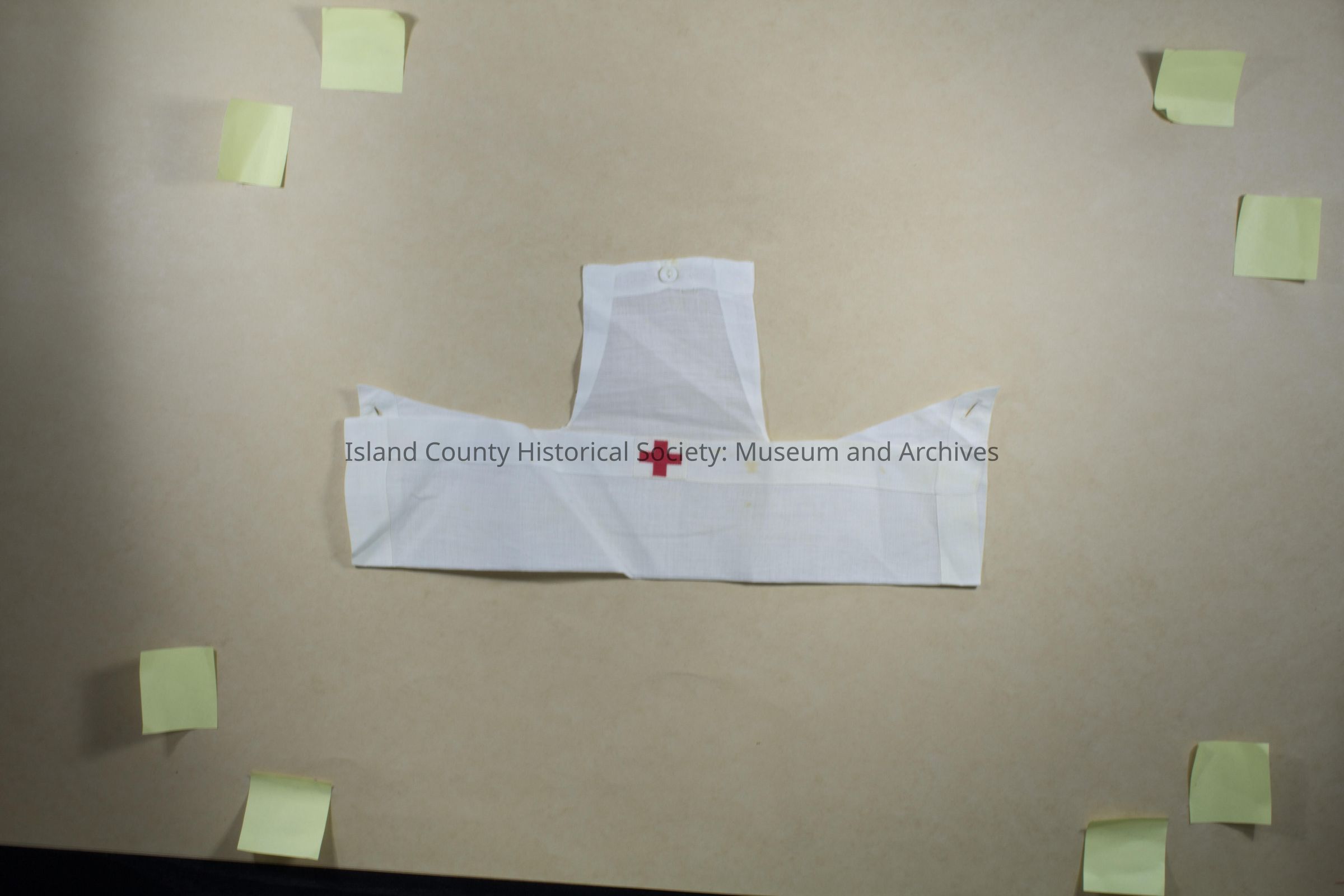 Cotton cap, unfolded with buttonholes and one plastic button on one flap. Stained. Middle has extra decoration of cotton rectangle with red cross stitched in