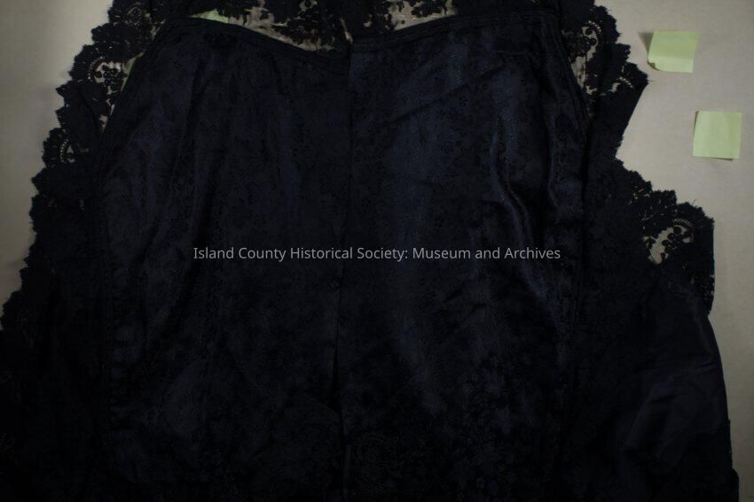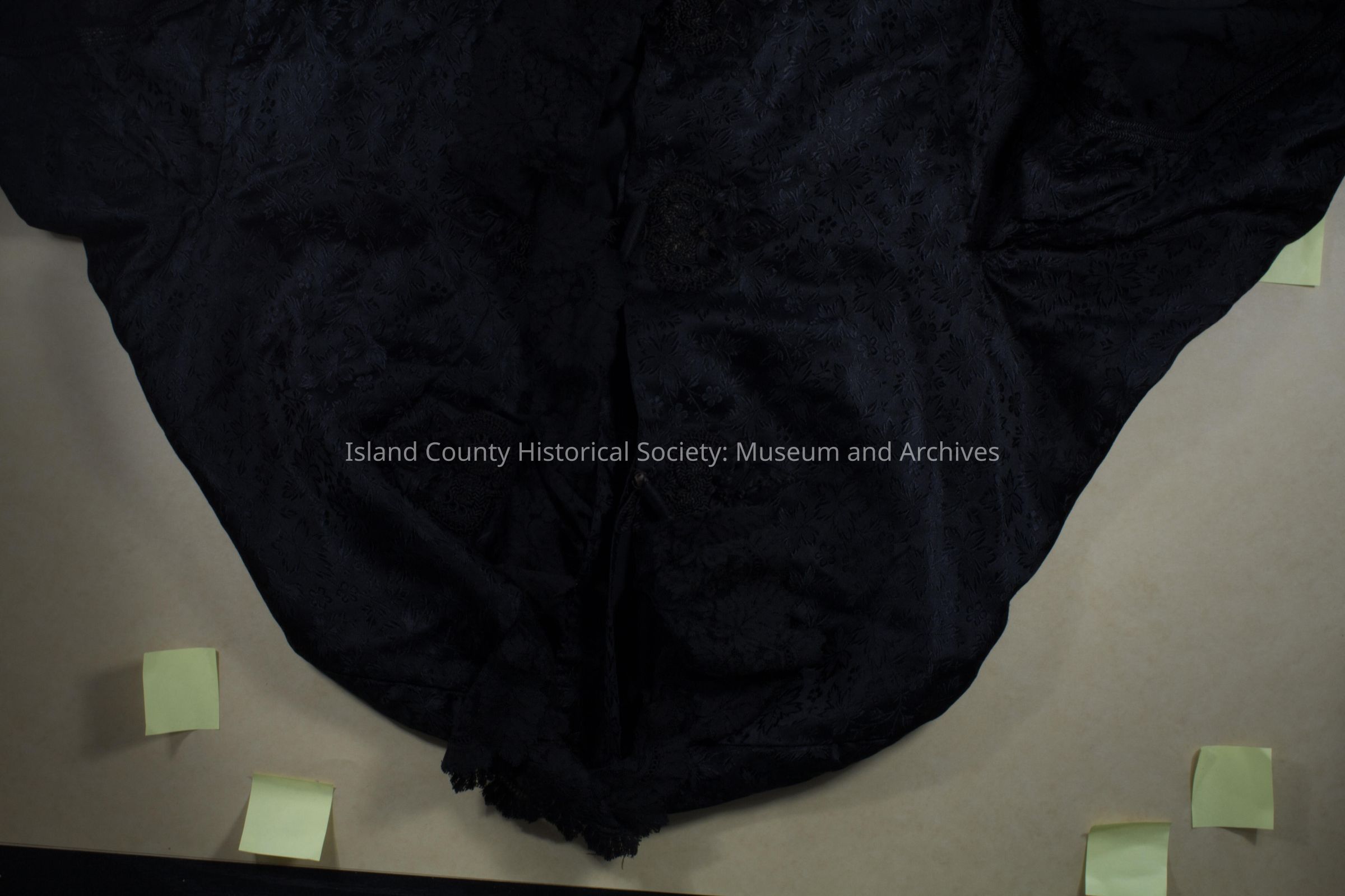Dolman sleeve black lace cape worn by Edith Dillon Kellogg (Mama Edie), first wife of Albert H Kellogg. Fringed collar and opening at the front and bordered. Fringe of lace. Bordered also with two strips of braid going all the way around. Plain with black lining inside. Seams inside are slightly frayed. Pinched and fitted at the back with more cord braid embellishments in the shape of three leaves and bobbles attached act as berries (four of them). Three loops and toggles along the opening at the front. Wooden toggles. Silk-satin like material with design of flowers and leaves.