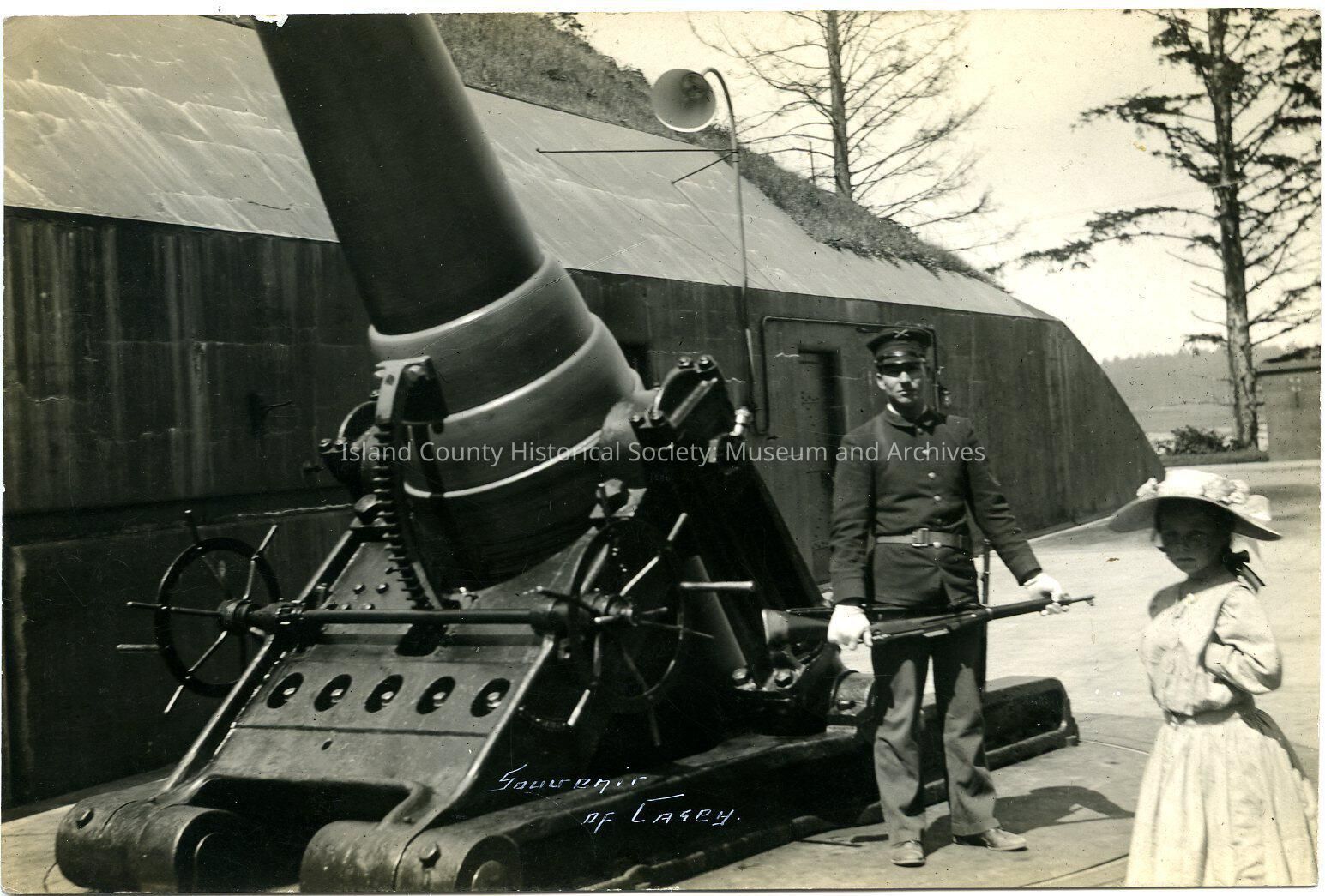 Black and white postcard image of Fort Casey gun, soldier, and girl taken in 1910. Written on the back: "Taken 1910 Capt. Stanley Hunziker - Clinton, Wash."