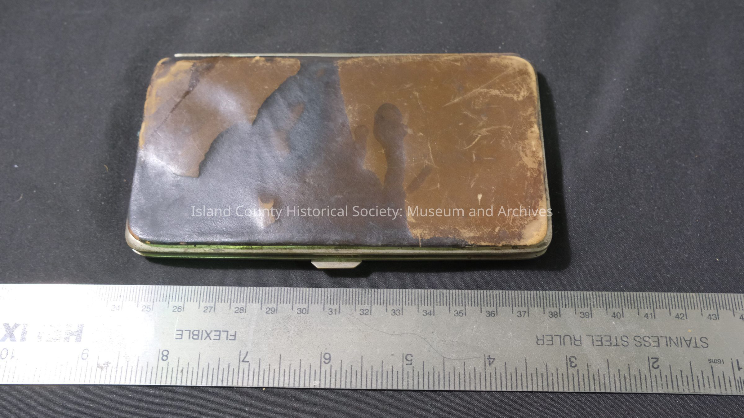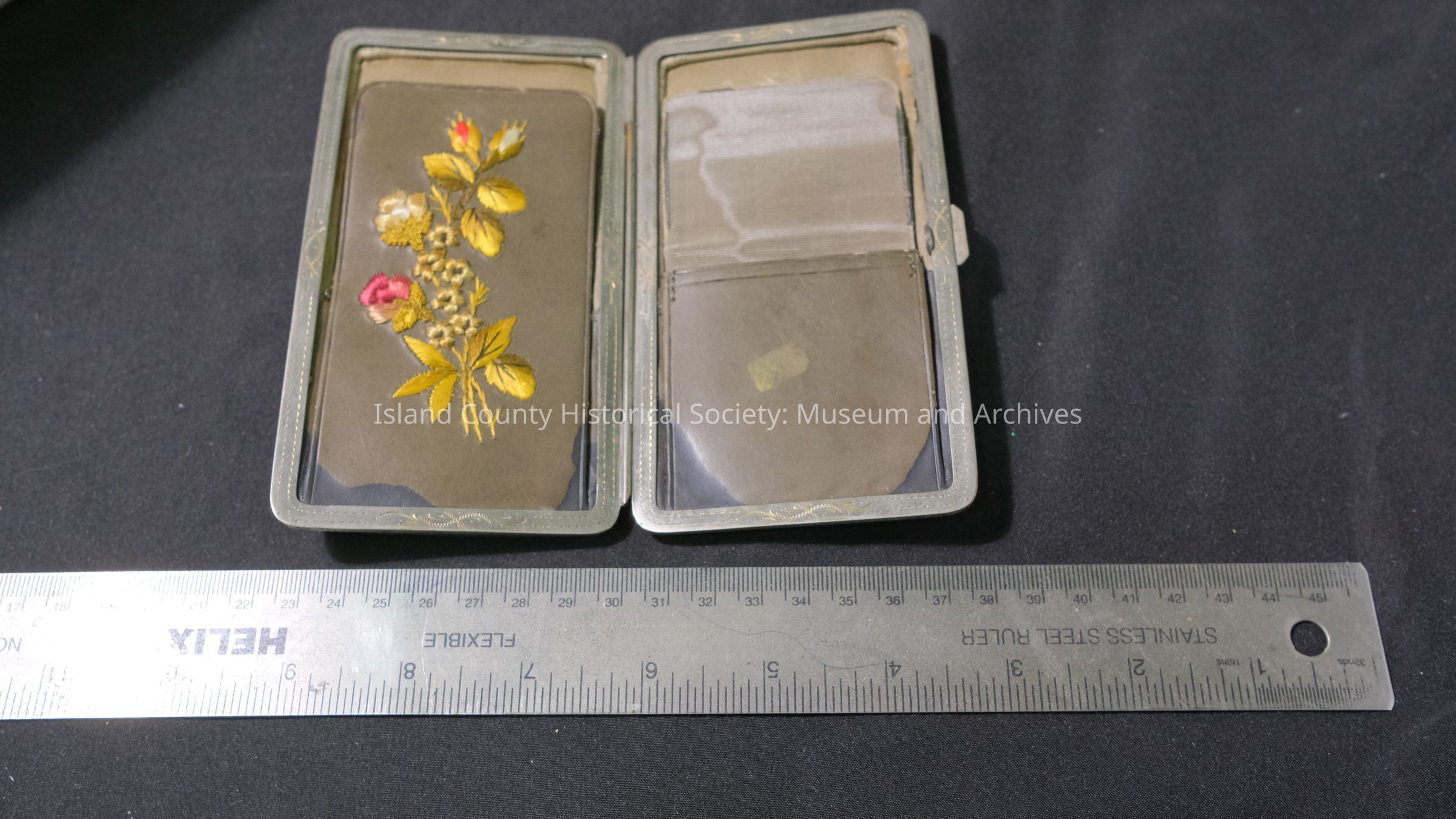 Brown Card Holder; Gentleman's card holder & wallet. Silver frame, yellow floral embroidery inside leather cover. 5 x 3