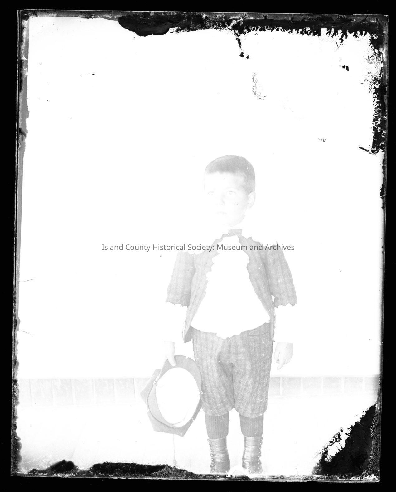 Photo of a young boy, dapper!, in a shirt with a lacy large collar, large lacy sleeves and lace down the front, plaid or checked short jacket and trousers and holding a hat, wearing button-up shoes.Made/Created