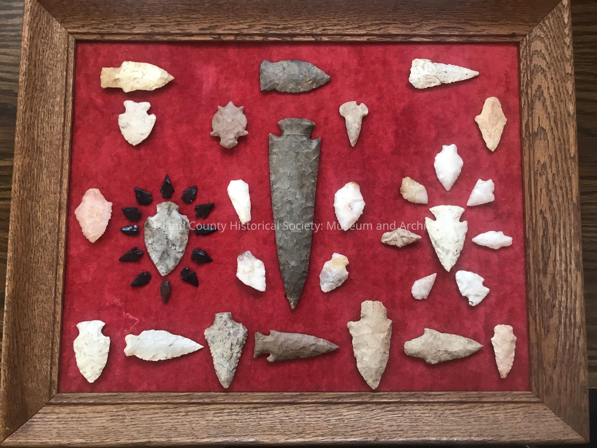 40 stone arrowheads of different size, shape, and color mounted on red velvet, framed in wooden frame.