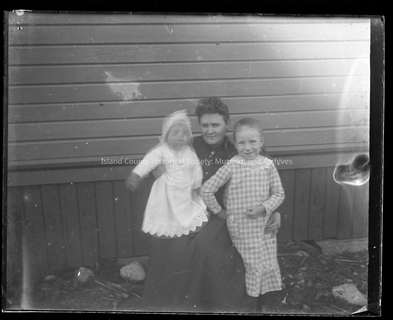 Photo of a seated woman holding a small child with a young girl beside her. The woman is wearing a dress, the girl a checked dress and the child a dress with lace and probably matching lacy cap. They are in front of a wood sided building. Same woman and child are in 2015.004.034.Made/Created