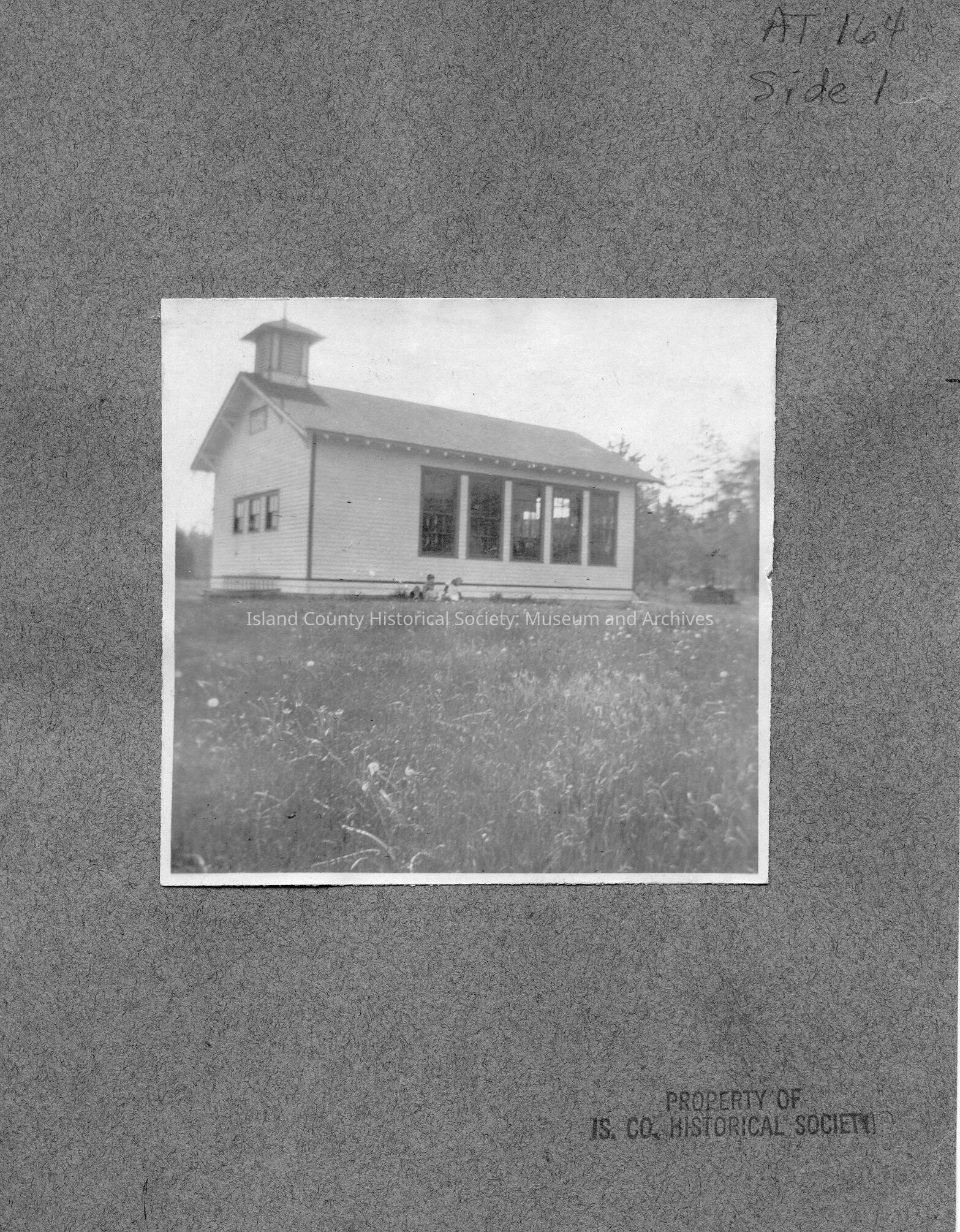 Smith Prairie School, later used as a residence. Photo is of back of building, with 5 large windows. 3 smaller windows are on end. Tower sits atop. 2 students sit on grass next to building.