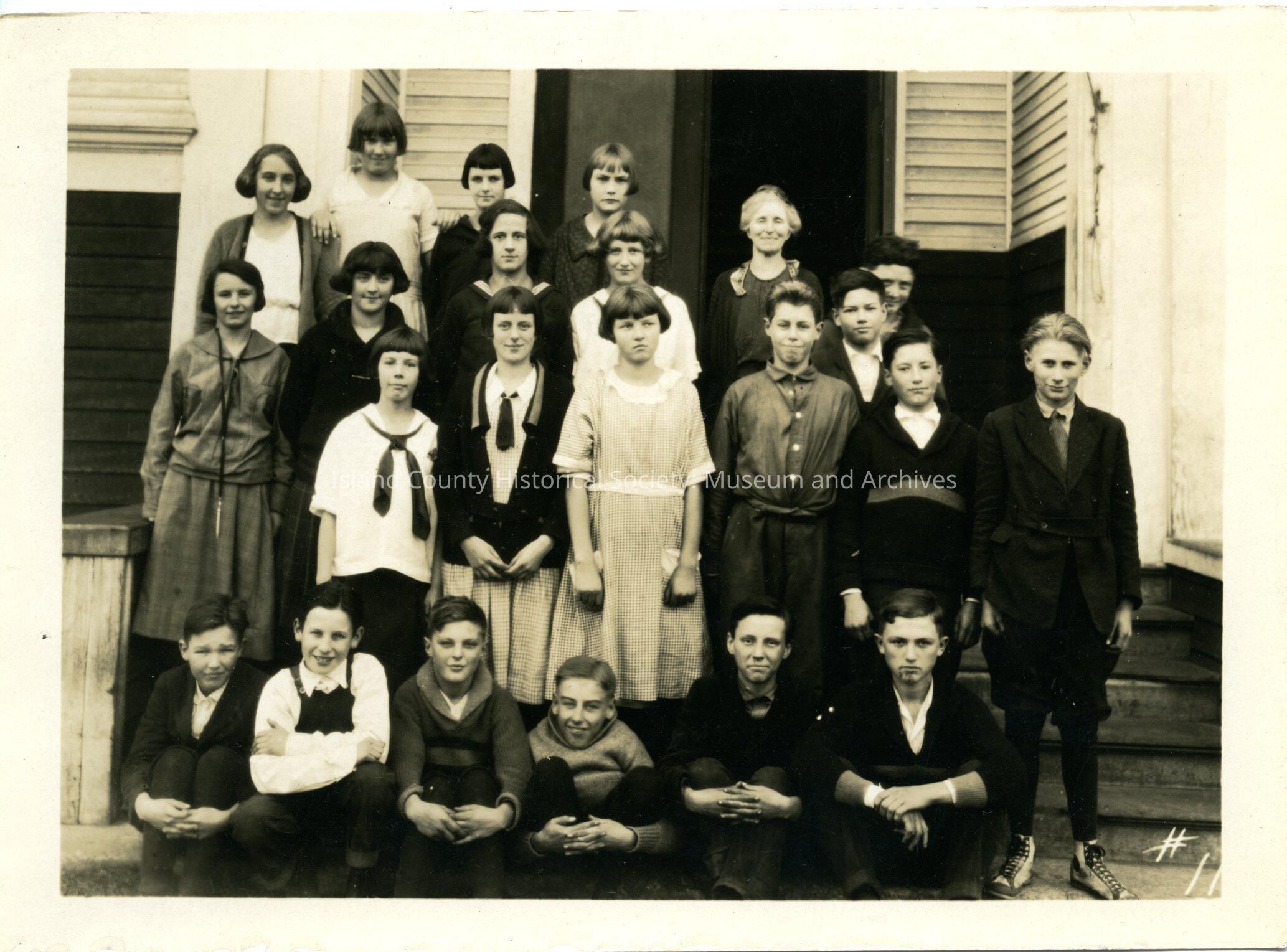 Black and white photo of a group of 22 students standing or sitting on a porch outside a wood-sided building. They are in front of double doors, one of which is open. The girls are wearing dresses or skirts (knee-length), bobby socks or knee socks and shoes, and long ties. The boys are wearing shirts, sweaters/vests and trousers, shorts or overalls. The teacher (woman) is standing in the back on the right. Almost same photo as 2018.038.016.