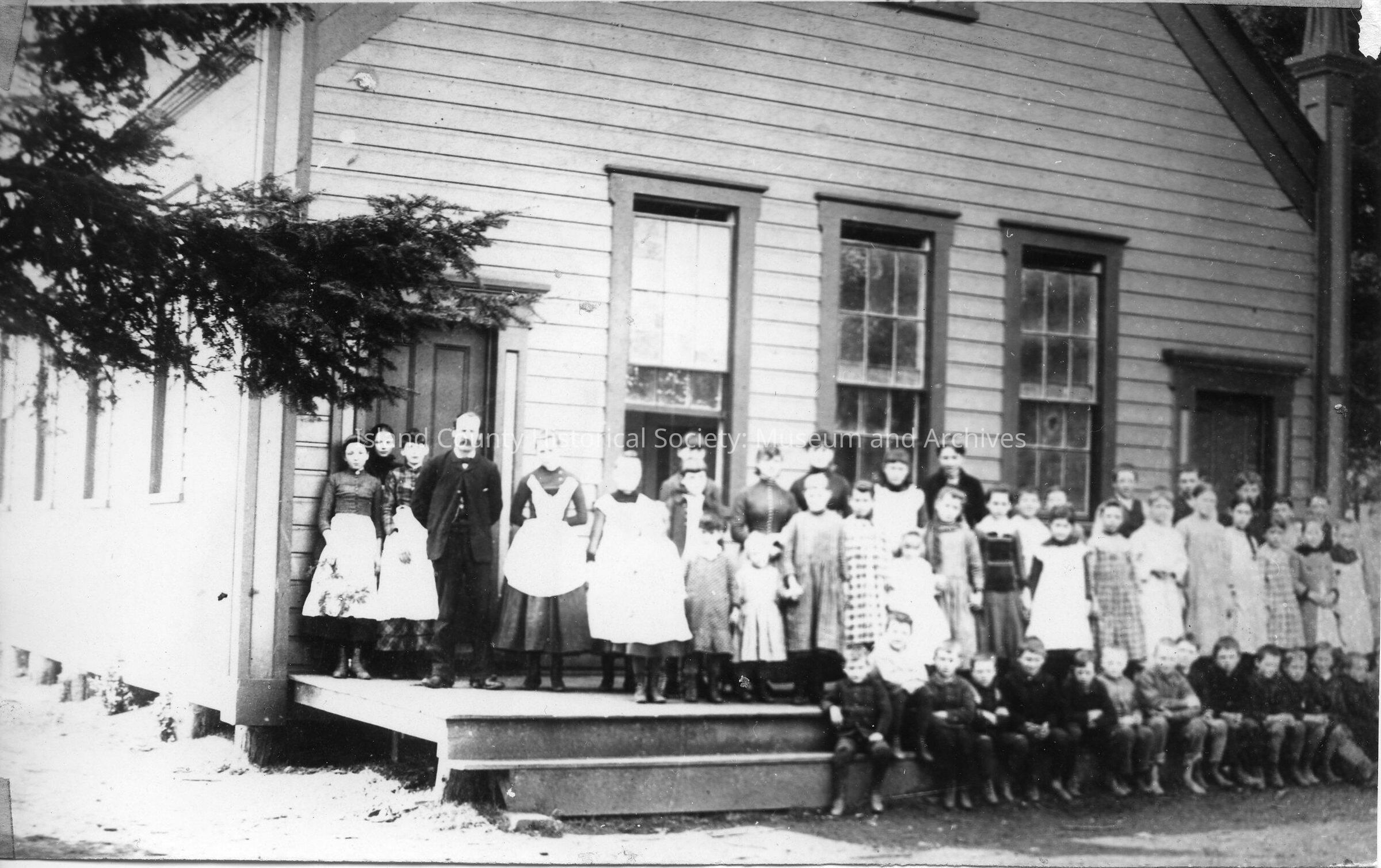 Coupeville Grade School. Building has two doors and 3 windows. Over 40 children stand on porch with teachers. The building later became the John Priest home.