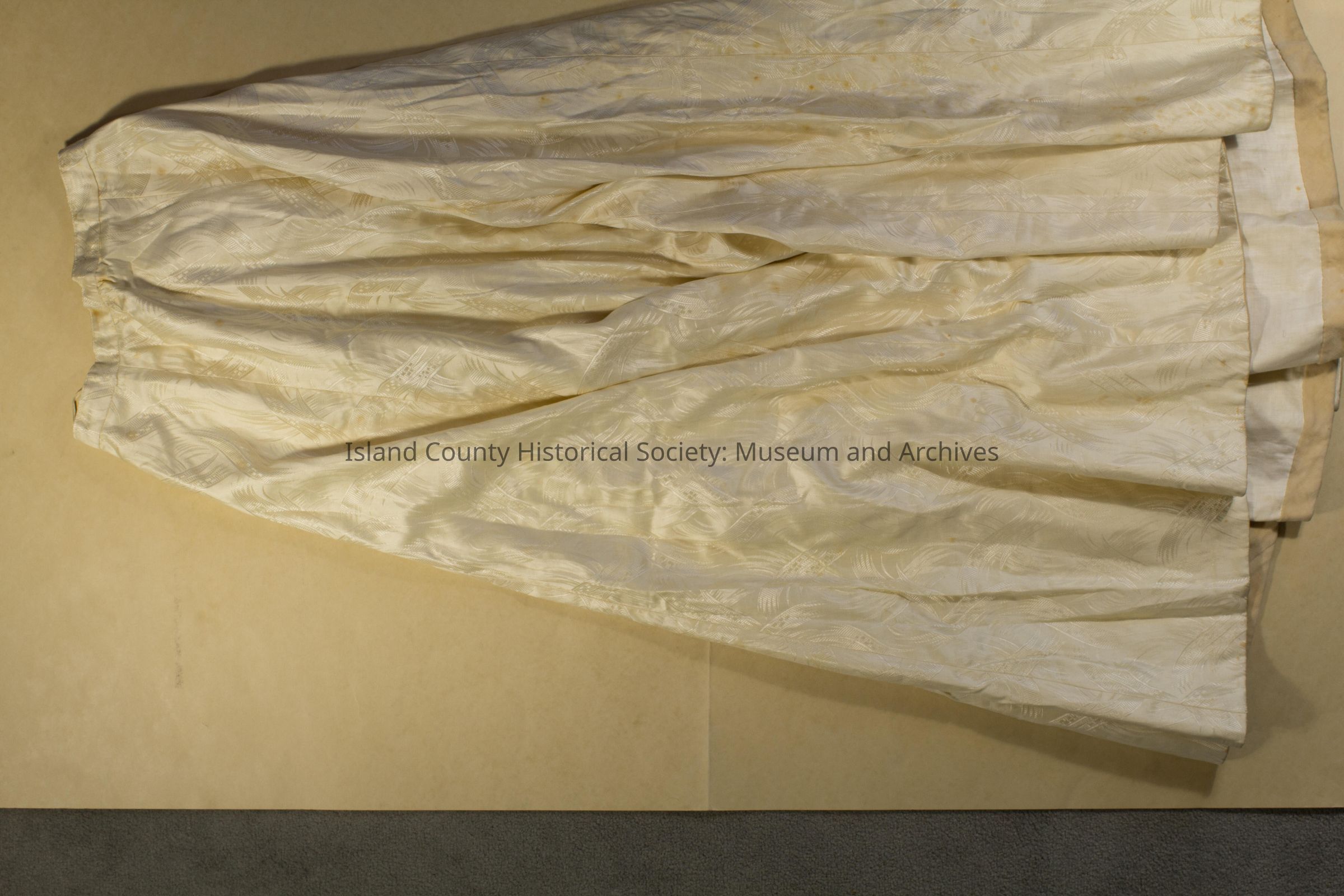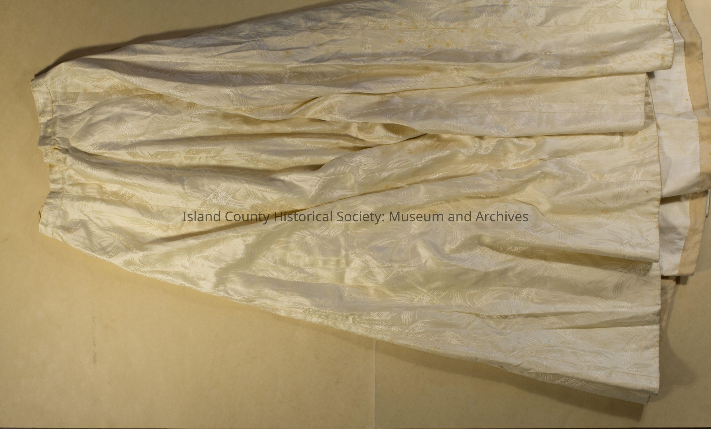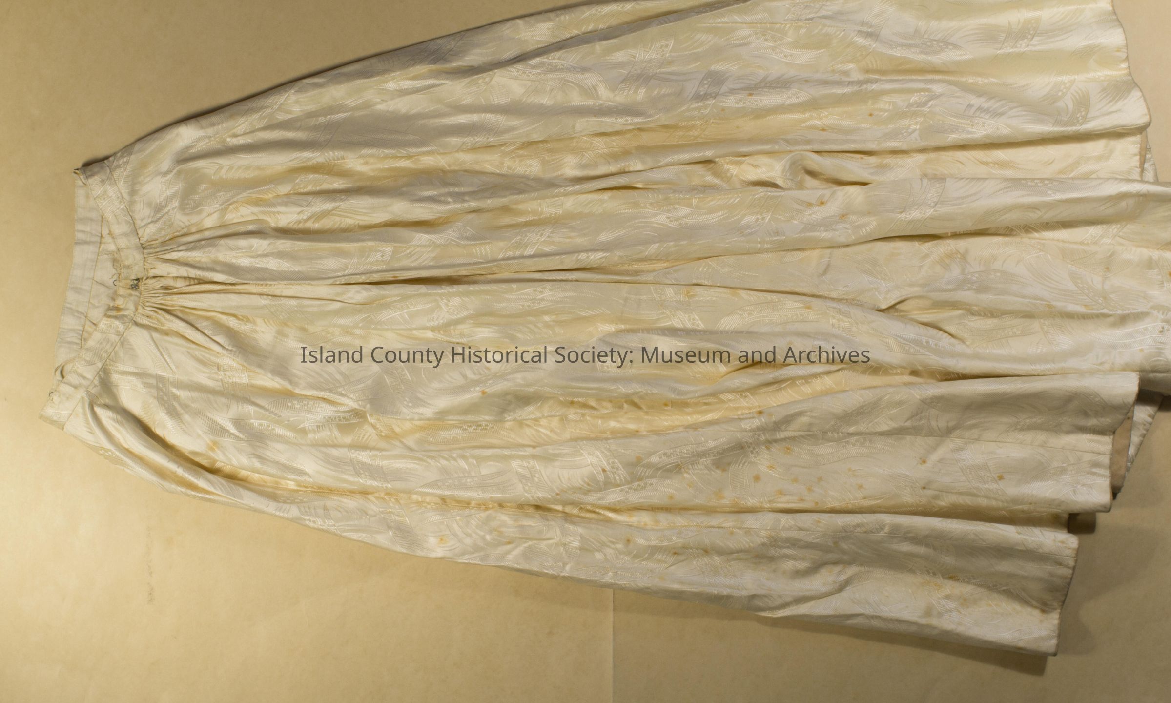 Ivory colored wedding skirt that belonged to either Maud or Anna Wormer. The skirt hangs short in the front and long in the back. Ribbon laced backing with eyehook closure. The dress has numerous yellow spots that could be mold, mildew, etc.Collection