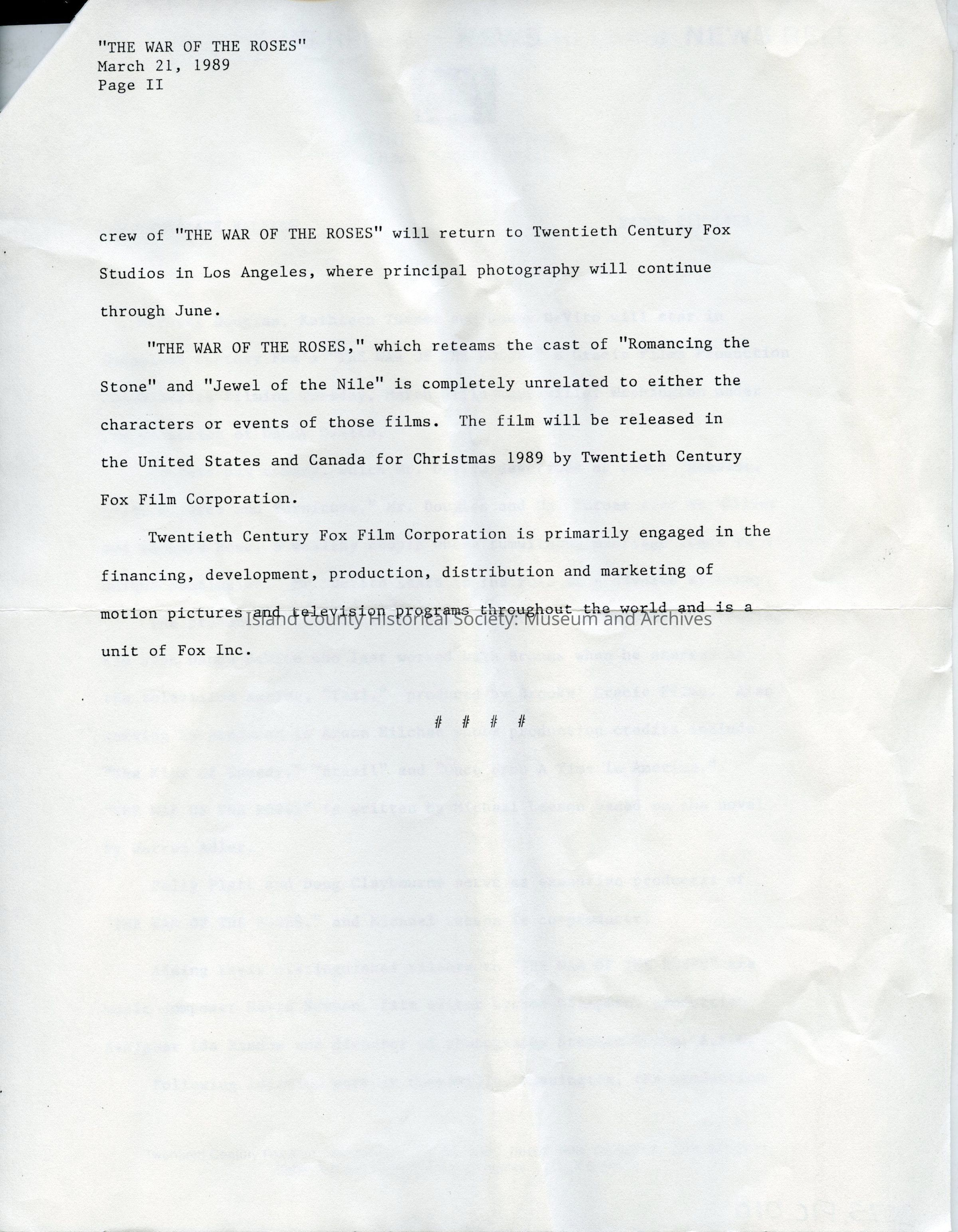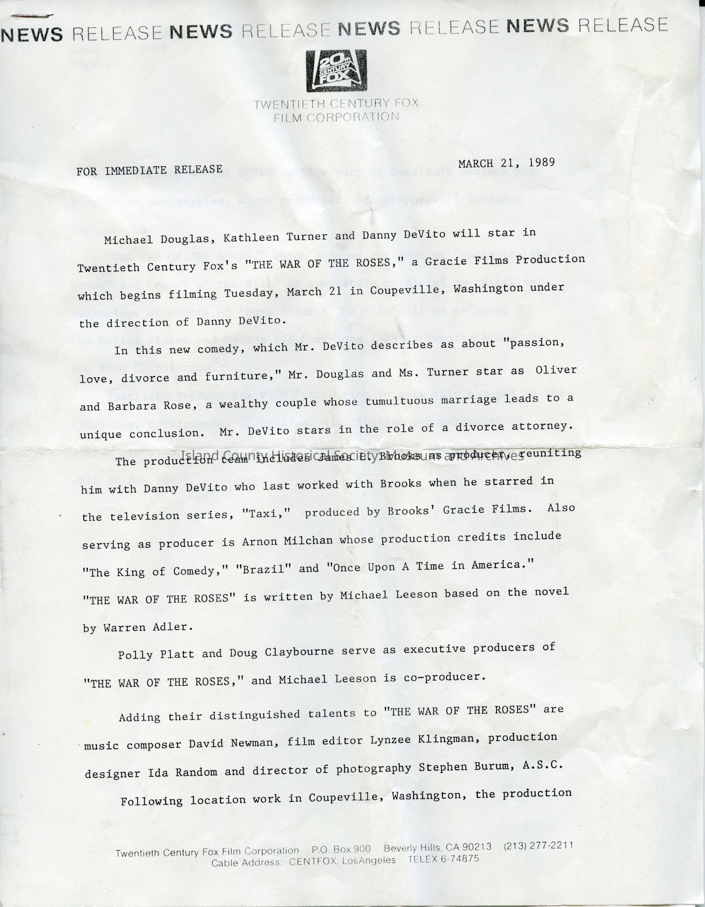 News Release regarding the film, The War of the Roses, which was filmed in Coupeville.