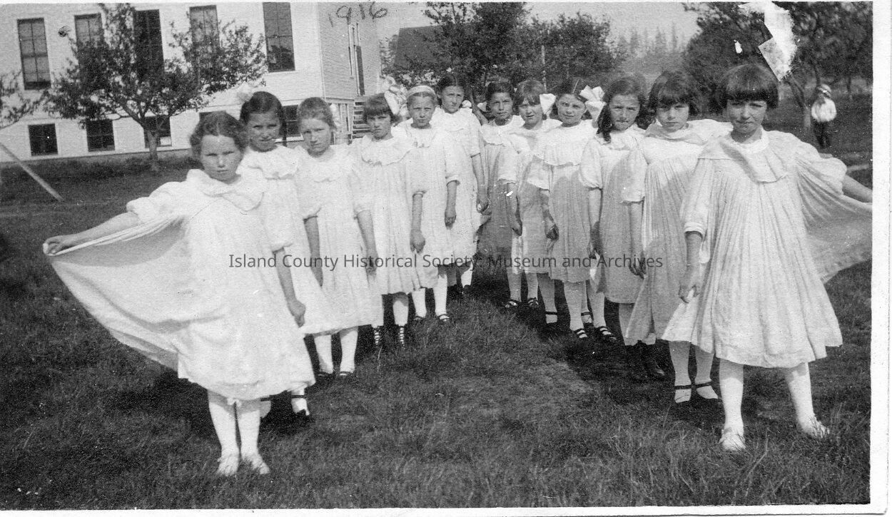 Twelve young girls in white dresses and white stockings stand outdoors in V. They hold light capes to side. "Esther Libbey, 1916" written on back with name of teacher and students illegible.