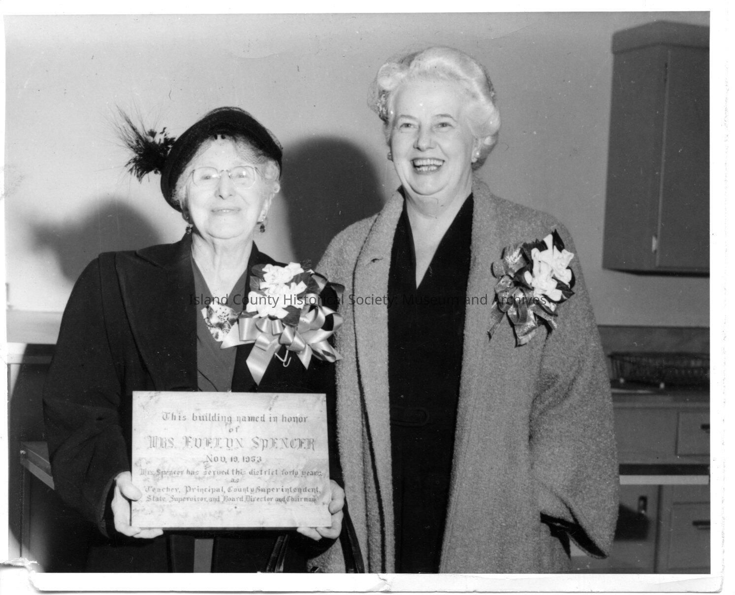 Black and white photo of Evelyn Spencer and Pearl Wanamaker indoors. They are wearing coats and hats and corsages. Evelyn Spencer is holding a plaque which reads "This building named in honor of Mrs. Evelyn Spencer Nov. 19 1953. Mrs. Spencer has served this district forty years as Teacher, Principal, County Superintendent and Chairman.