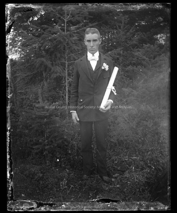 Photo of a young man dressed in a suit with stiff white-collared shirt with a white bowtie, and a buttoniere, holding a diploma and standing in a wooded area.Made/Created