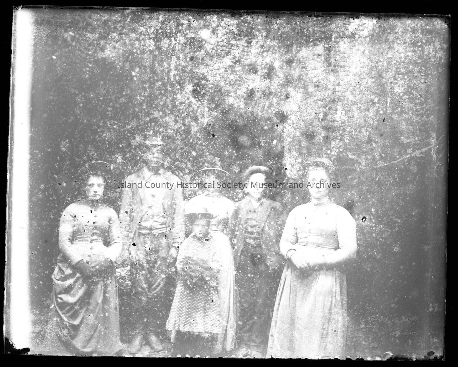Photo of a group in a wooded area: a boy and girl, three women and a man, possibly African-American. They are in dresses, hats and suits. The girl appears to be holding a bunch of flowers.Made/Created