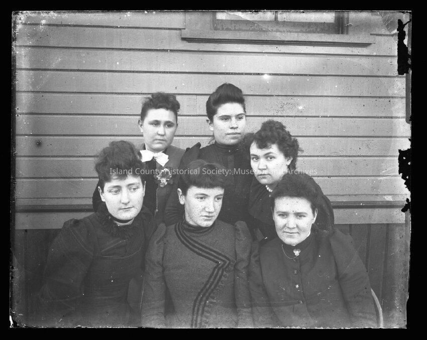 Photo of four young women and an older woman wearing dresses. Posed in front of a building. (The women on the lower right is also in 2015.004.046.)Made/Created