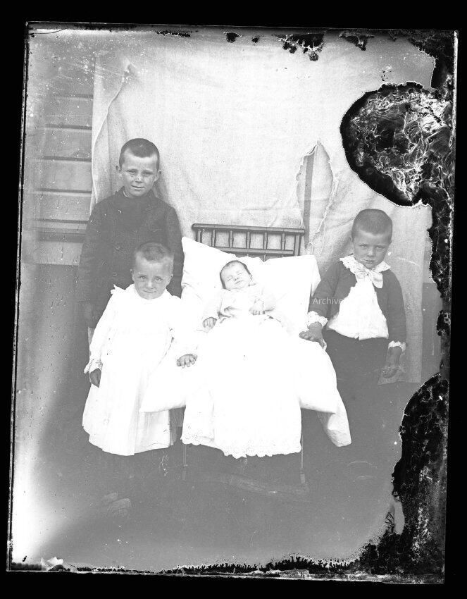 Photo of four children. The oldest boy is wearing a coat, the younger boy is wearing a jacket with a large lacy collar and sleeves and a bow, probably a boy in a dress is standing beside the crib and a child is asleep in the crib. They are in front of a torn blanket backdrop in front of a wood-sided building.Made/Created