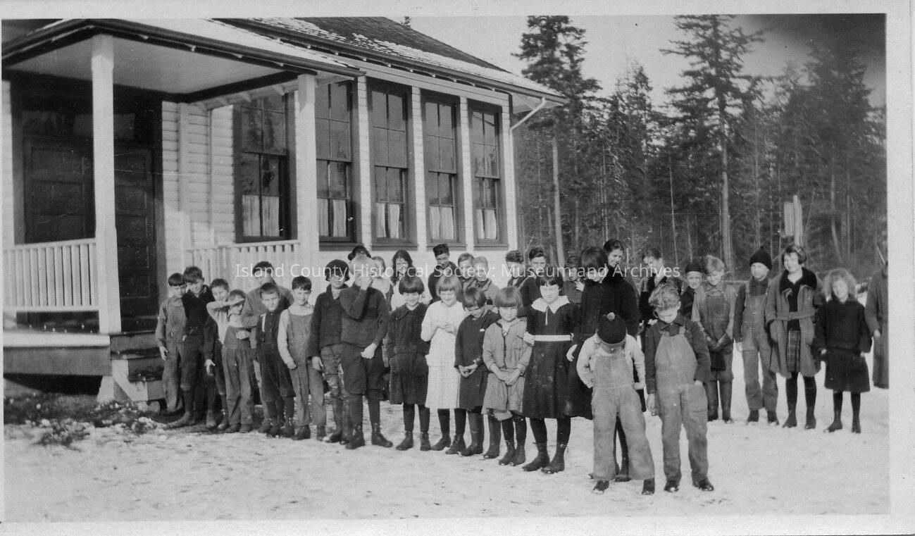 30+ students of varying ages lined up outside Greenbank School in the snow.