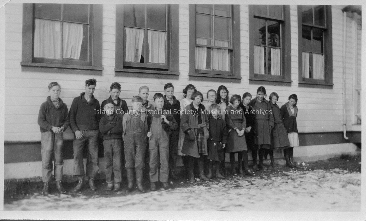 18 students of varying ages lined up outside Greenbank School building in the snow.