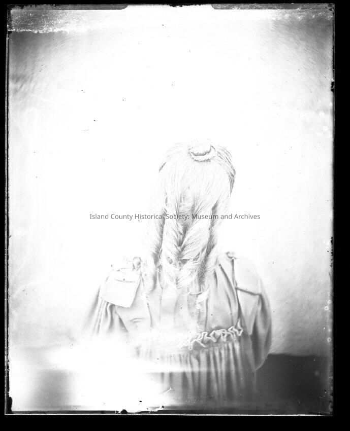 Photo of a girl from the back to show her long ringlets and small knot on the top of her head. Her dress has bows on the shoulders. She may be the same girl as in 2015.004.060.Made/Created
