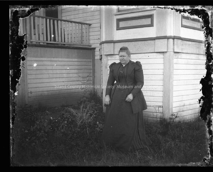 Photo of a large woman wearing a dress with a jacket. She is standing in front of a wood-sided building beside and slightly below a porch.Made/Created