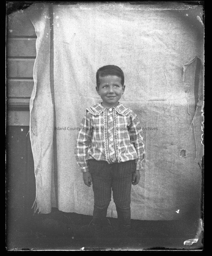 Photo of a young boy standing in front of a torn backdrop in front of a building. He is wearing striped trousers, large checked shirt with lace along both edges of the button placket and along the edges of the large collar.Made/Created