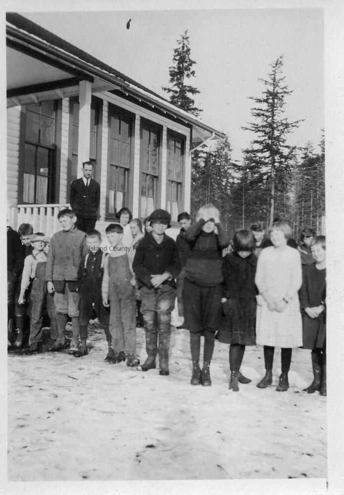 Students of varying ages lined up outside Greenbank School building in the snow. A teacher stands on the porch.