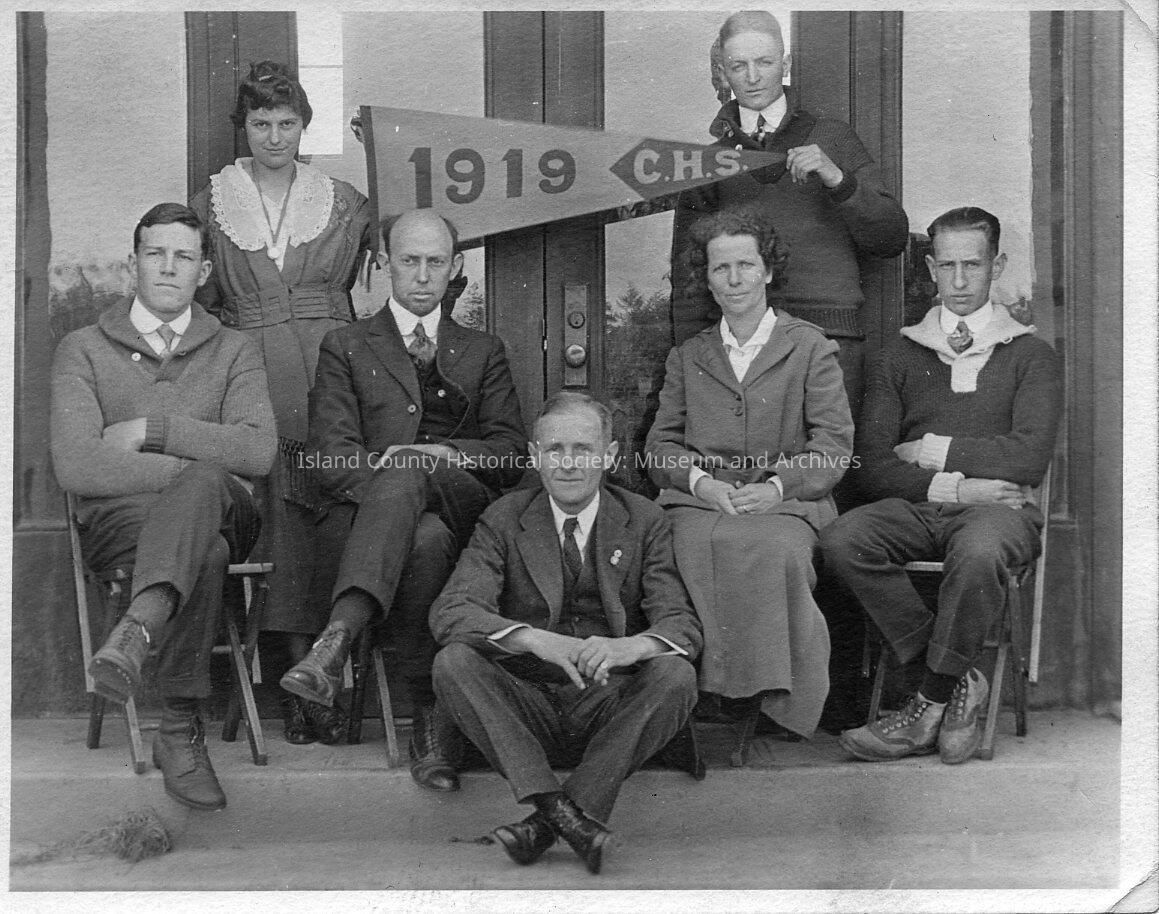 Coupeville staff on porch of school. Five men and two women are in the group. Two who stand hold a 1919 C.H.S. pennant.