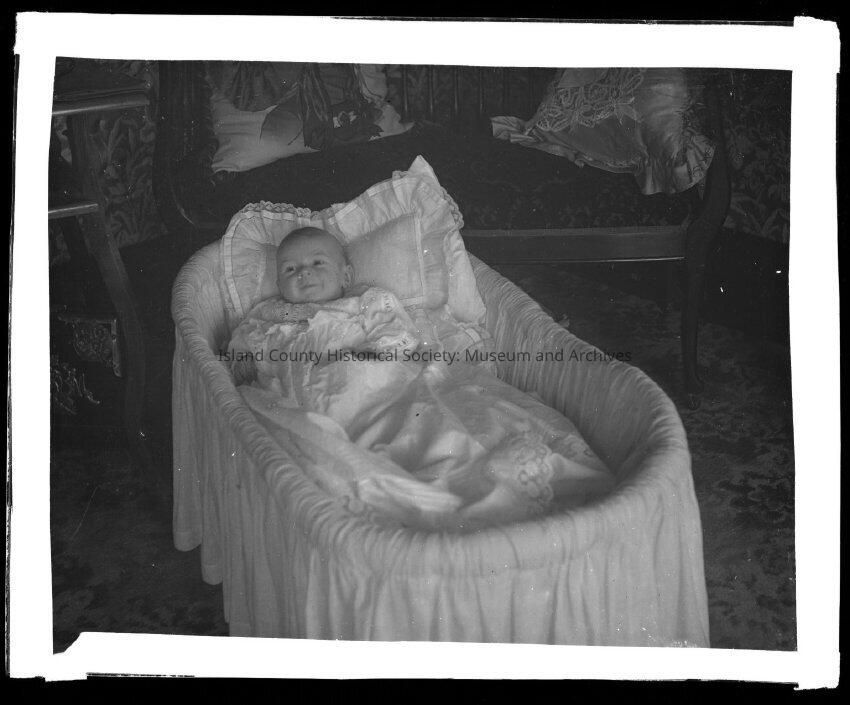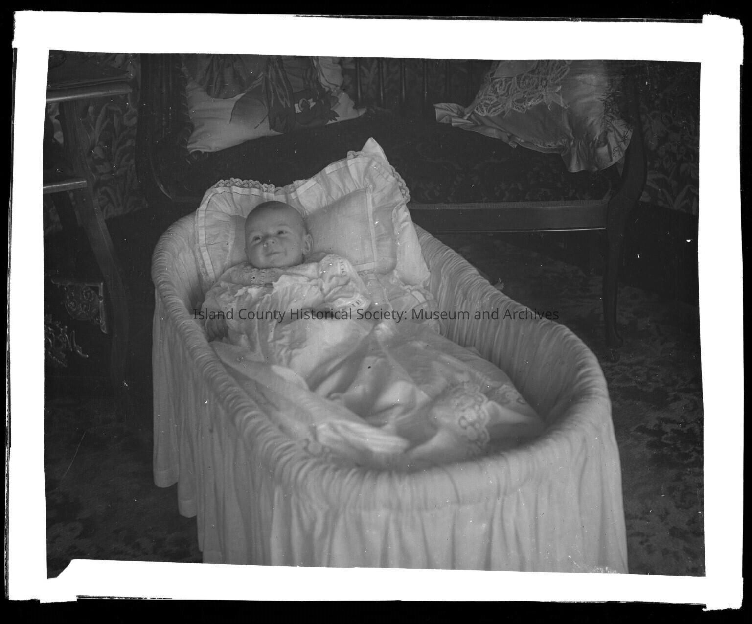 Photo of a child in a lacy dress in a crib with lacy blankets and pillow. Same as in 2015.004.068.Made/Created