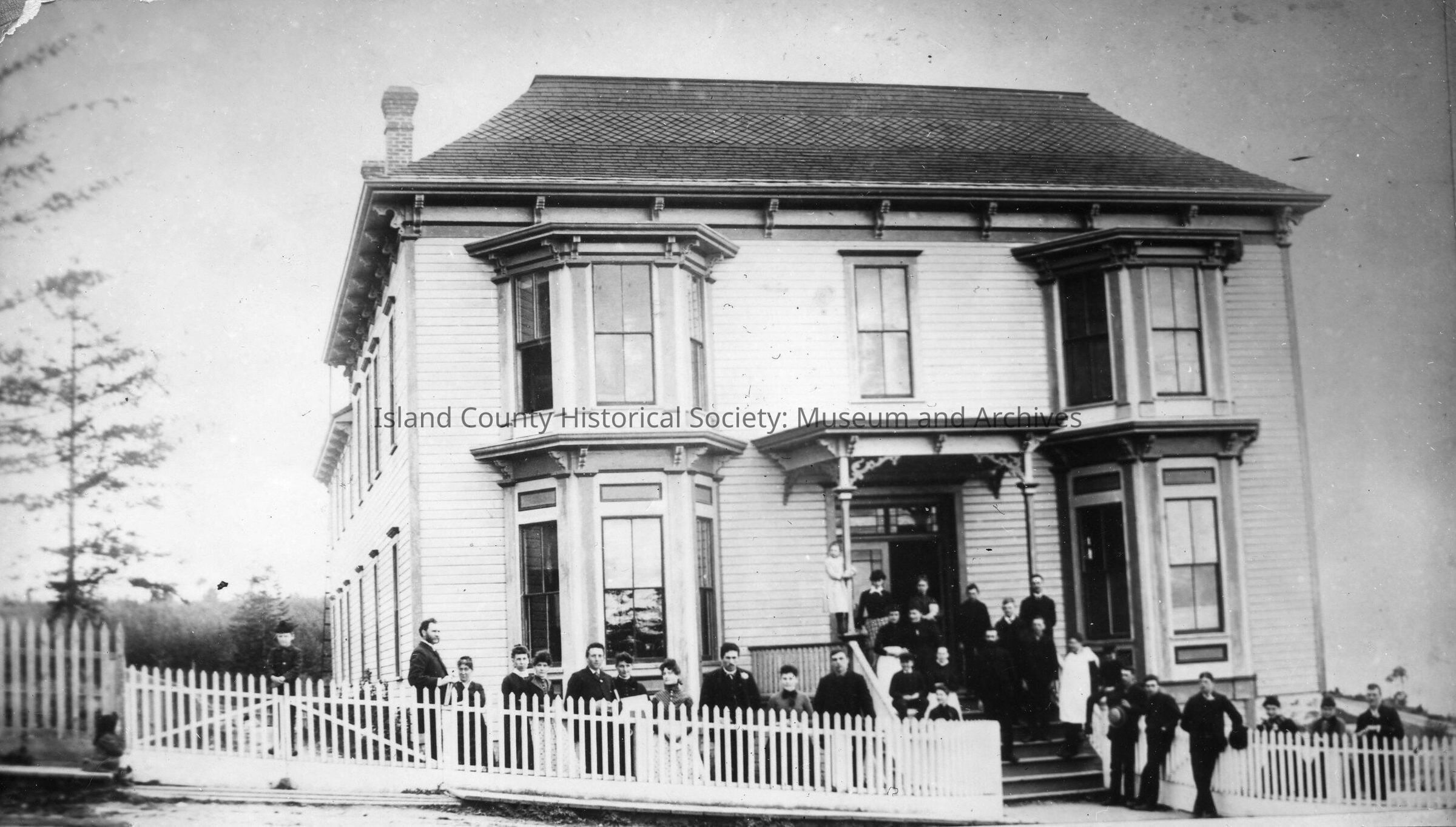 Puget Sound Academy, Coupeville, opened its doors in 1886. The above building was built in 1886 as a sanitarium by Dr. Highwarden and the same year sold for an academy uner the management of the Congregational Church. There were no high schools in the lower Sound and this was thought to be an ideal place for advanced learning. About 1896 the building burned.