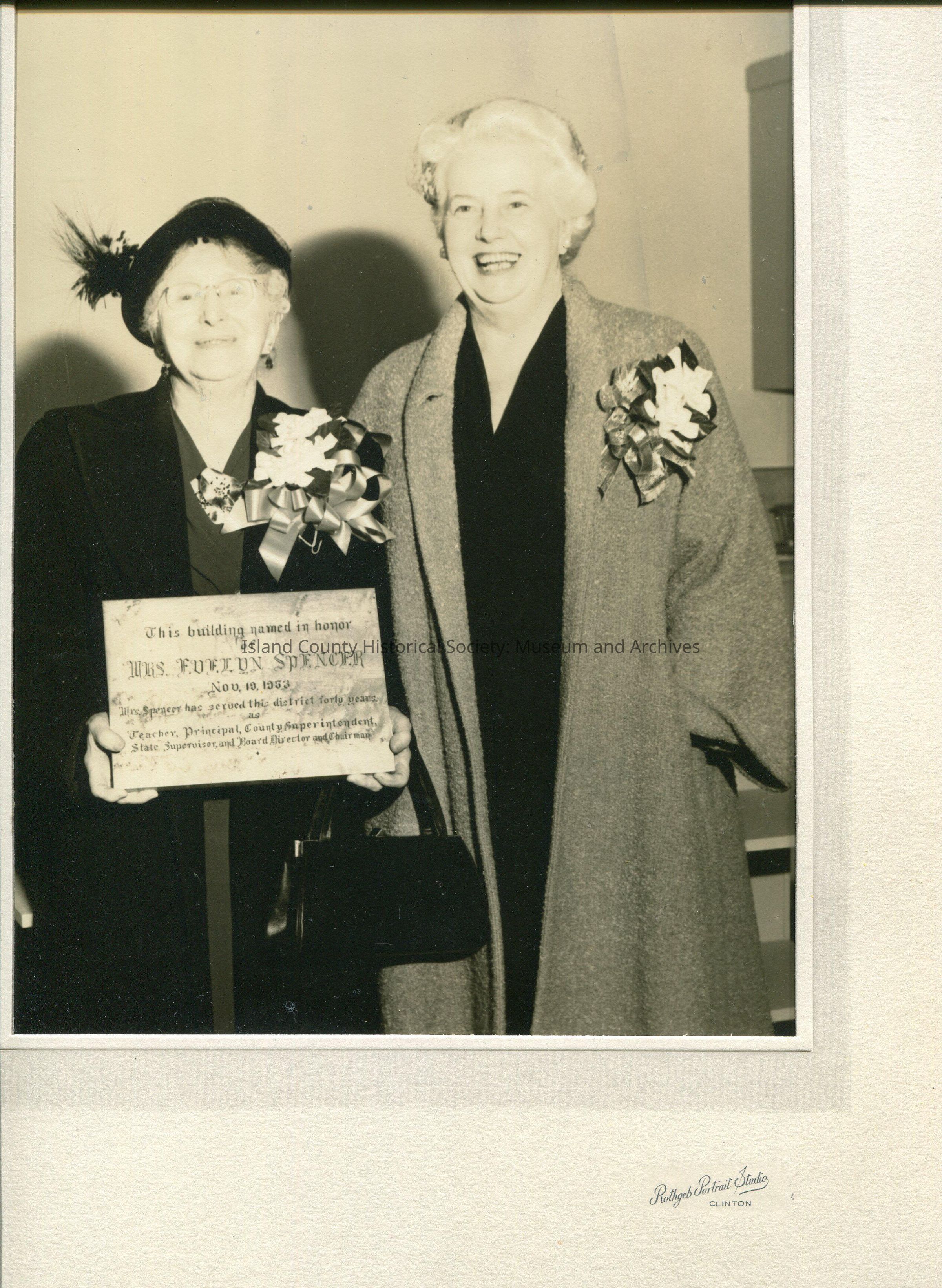 Black and white photo of Evelyn Spencer (on the left) and Pearl Wanamaker (on the right). Evelyn is holding a plaque: This bjuilding named in honor of Mrs. Evelyn Spencer, Nov 10, 1953. Mrs. Spencer has served this district forty years as Teacher, Principal, County Superinteindent, State Supervisor and Board of Director and Chairman. She is wearing a dress, black coat, hat with feather and large flower/bow arrangement on her left shoulder. Pearl is wearing a dress, coat and has the same arrangement.