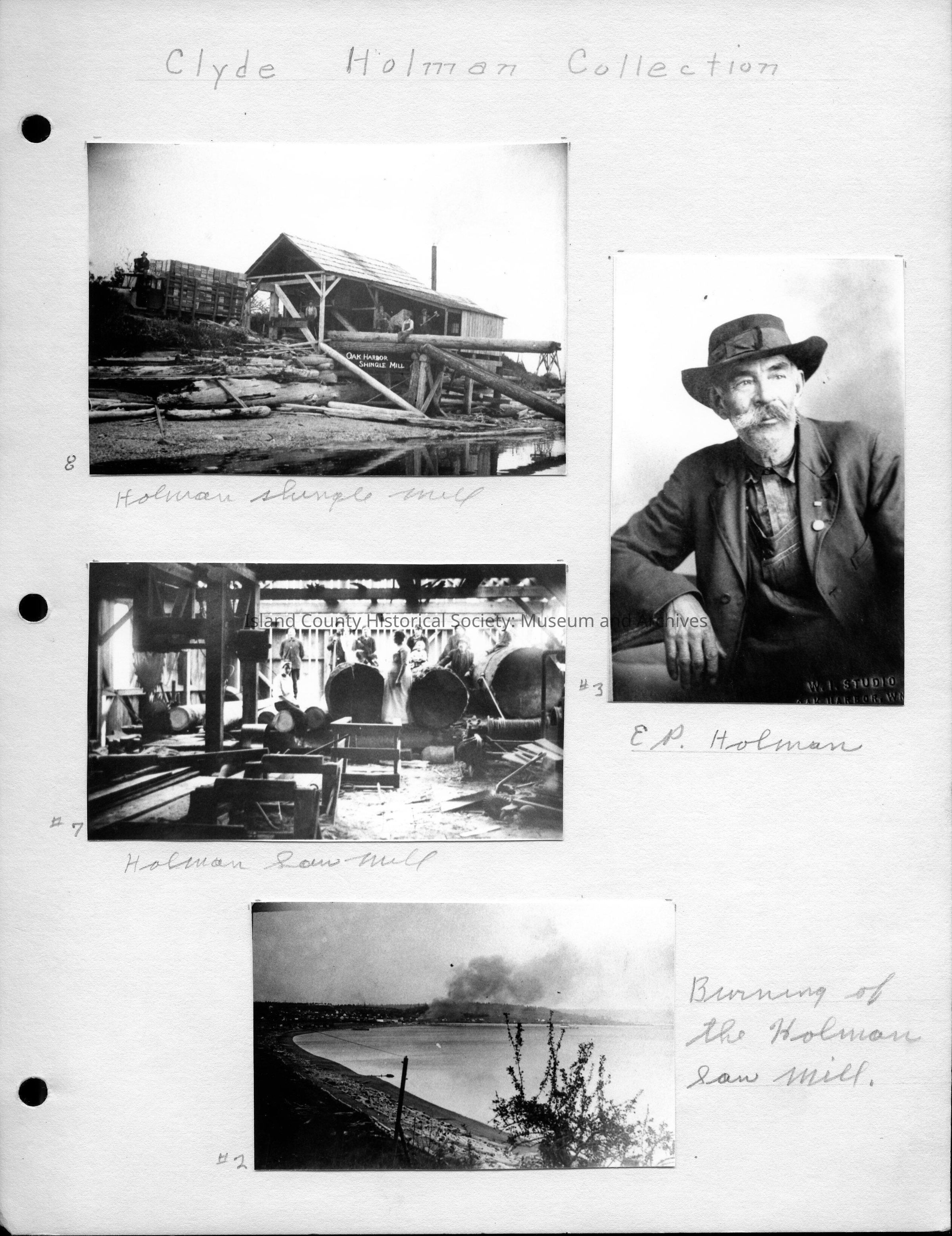 Top Left Photo - 4.25"W x 3.0"H - Photo of the Oak Harbor Shingle Mill. The photo shows the open-sided structure with logs in front and a truck behind the building stacked with finished shingles. A man is sitting on top of a long log above the Oak Harbor Shingle Mill sign. Below the photo: " Holman Shingle Mill" No date.