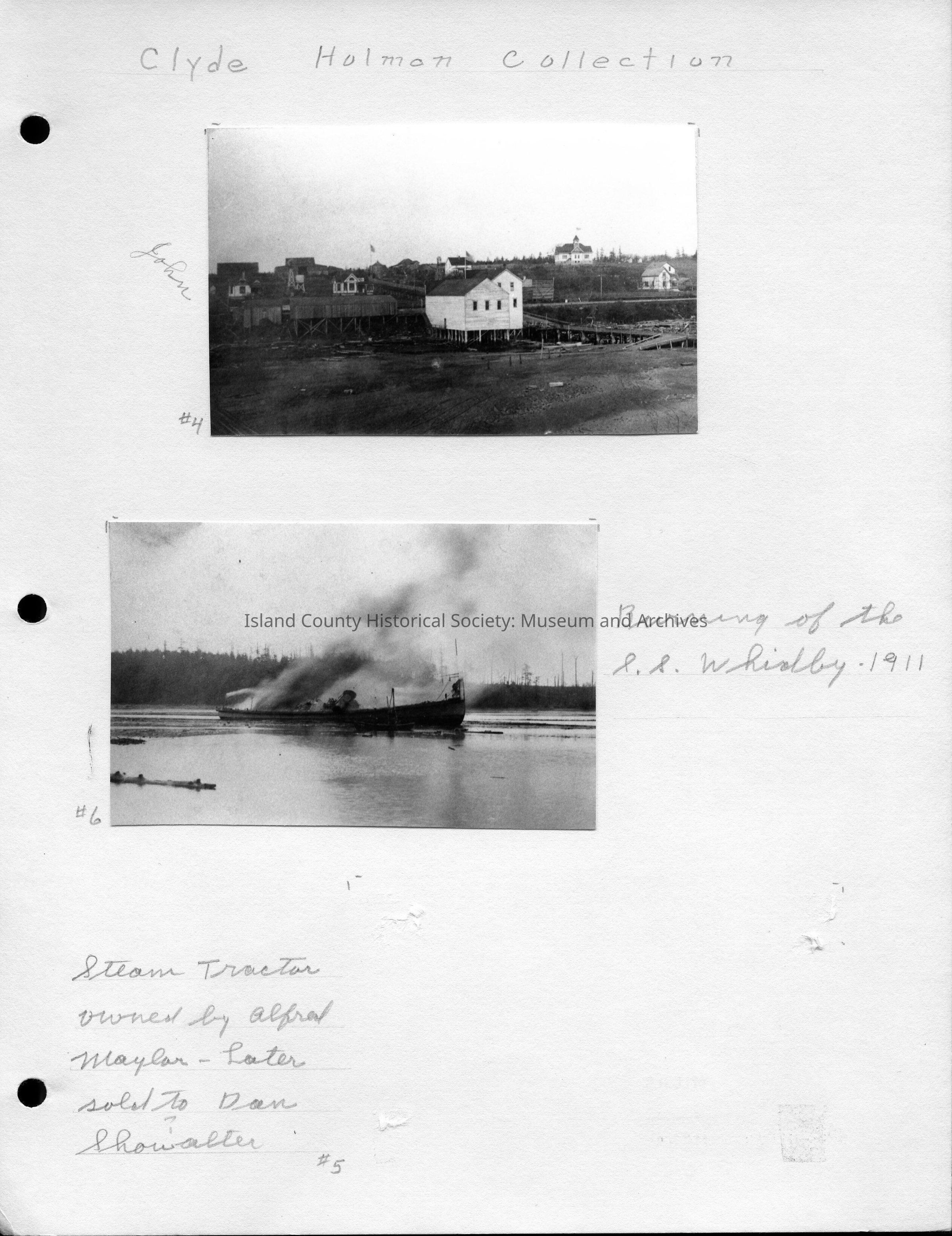 Bottom Photo - 3.75"W X 2.25"H - Photo of Oak Harbor shoreline with smoke rising from the shore in the distance. Written next to the photo: ".Burning of the Holman Saw Mill" No date.