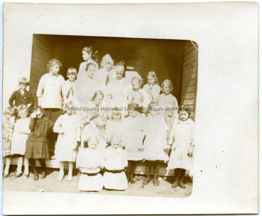 Photo of 21 children of multiple ages in front of a building entrance. Most are wearing white dresses. Back reads: Liv. Bay.
