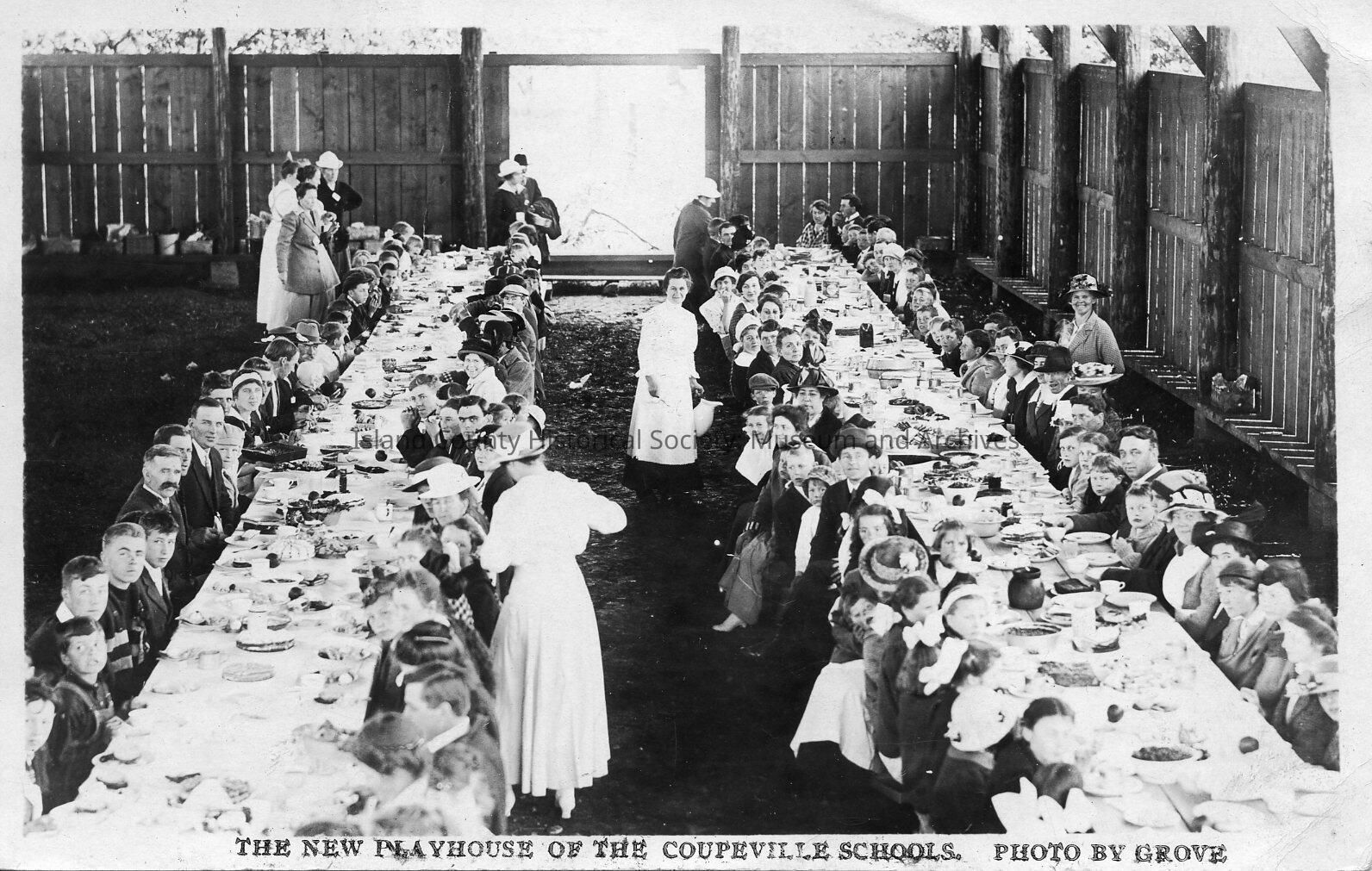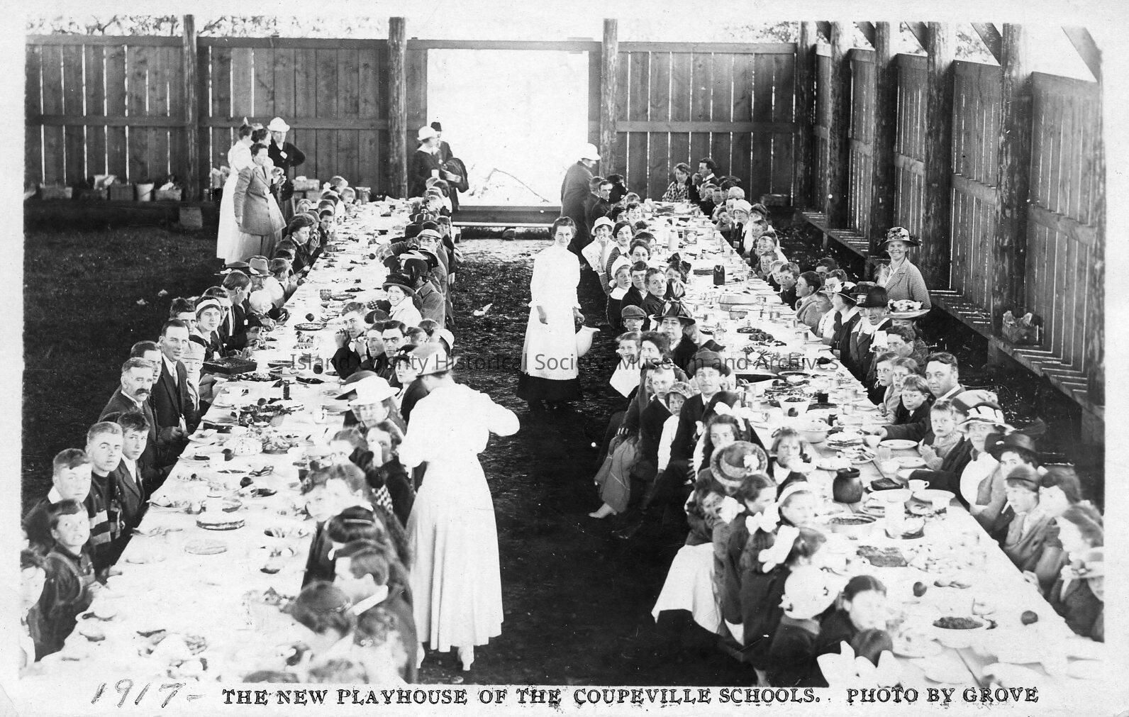 Dedication of the new playhouse (Play Pavilion) of the Coupeville Schools, May 23, 1917. A semi-enclosed wood structure with dirt floor and benches along edges. Long tables are set up with white tablecloths and food. Families in best clothes are seated. Women pour from pitchers and serve food. On back of second copy: Left-side of left table 8th man - Will Edmundson. Woman in white standing between tables - Louise Mitchell? Woman in hat, standing to right of righ table - Gertie Parker. 5th person right side - Nettie King (black hat).