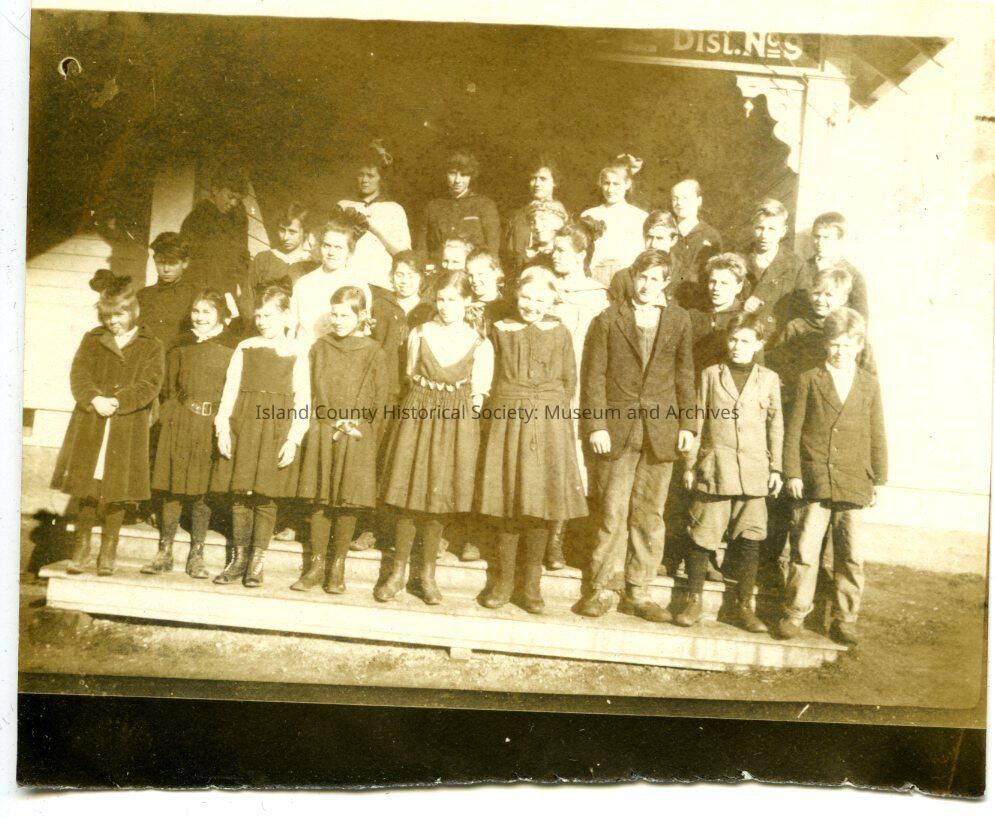 Photo of older children in front of a building entrance. Dist. No. 9 is painted on beam. Back reads: Liv. Bay.