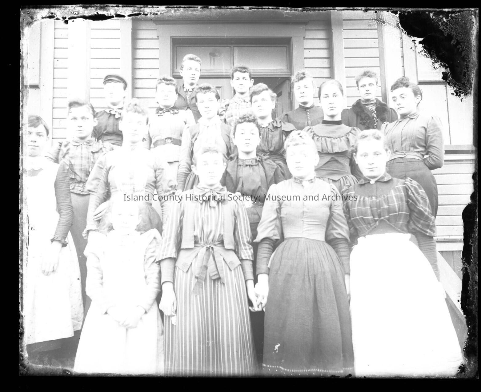 Photo of a group portrait of seventeen women in front of a school house. There is damage on the top and bottom right of the photo.Made/Created